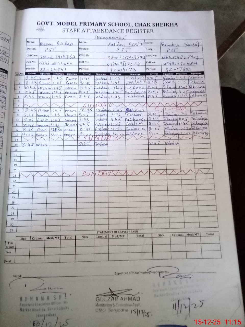 | CNIC | Full Name | Designation | R/C | Absence During Last Calender Month |