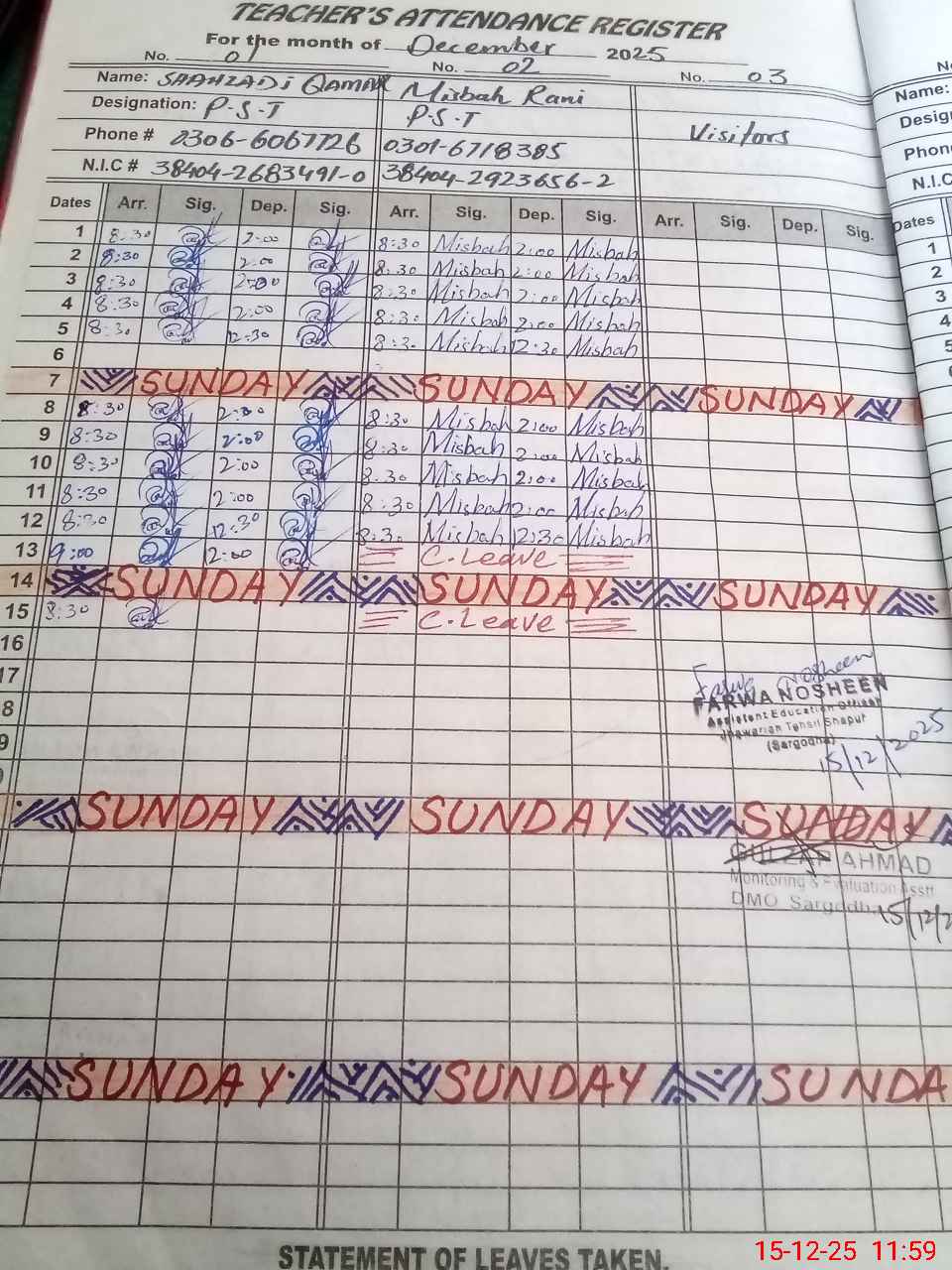 | CNIC | Full Name | Designation | R/C | Absence during last cal. month |