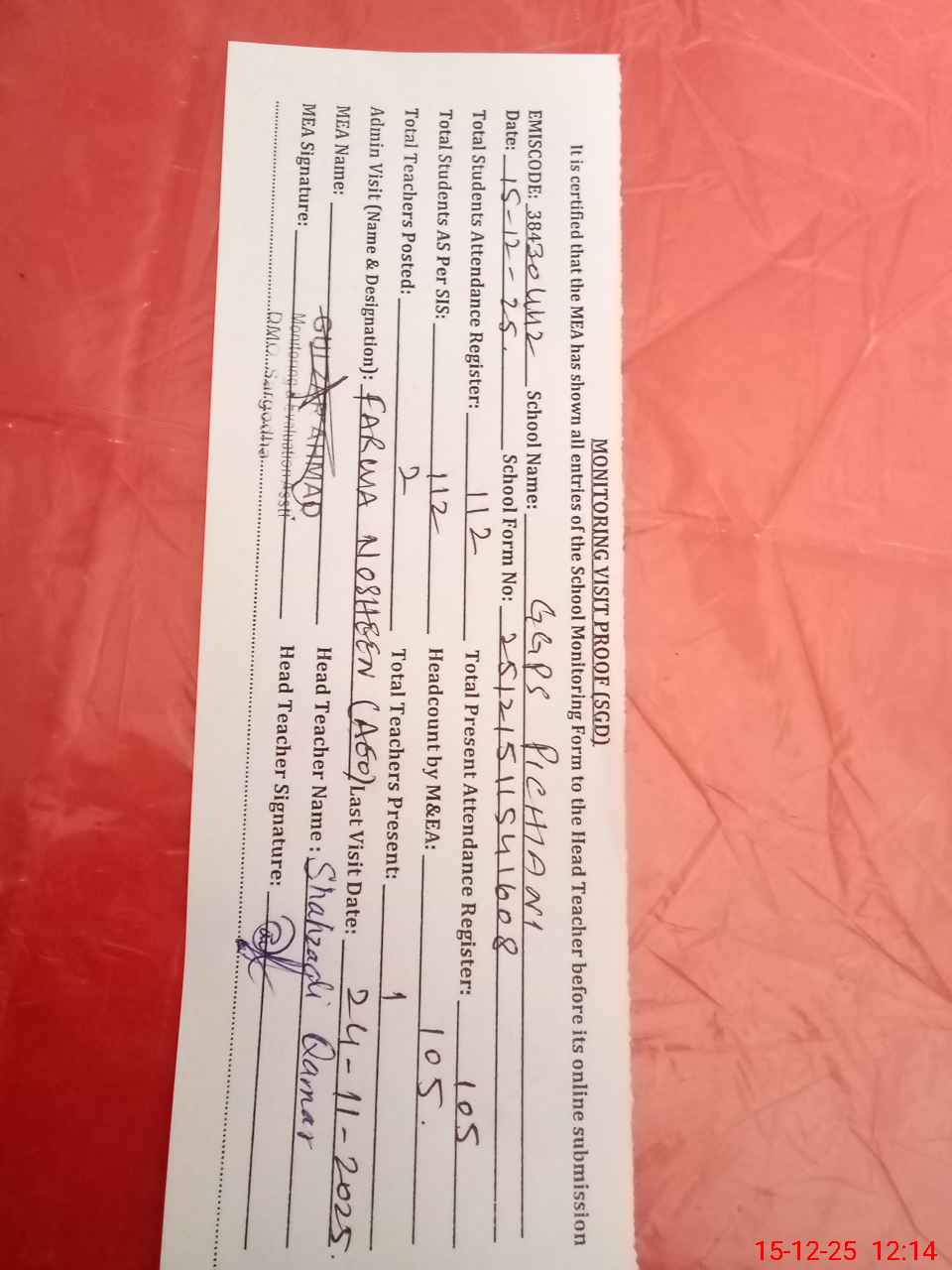 | Attendance Register | Head Teacher | MEA with School | Visit Proof |