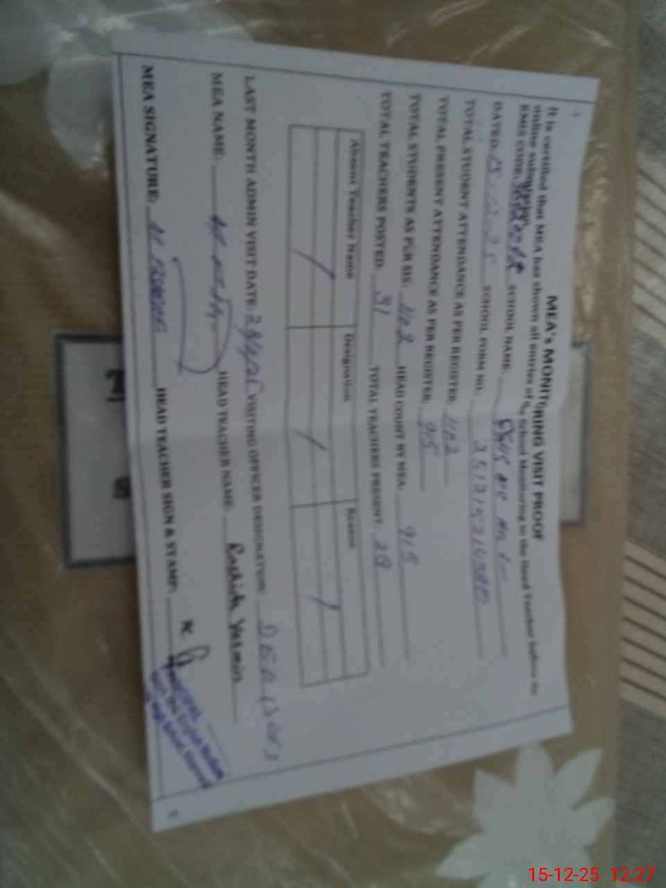 | Attendance Register | Head Teacher | MEA with School | Visit Proof |
