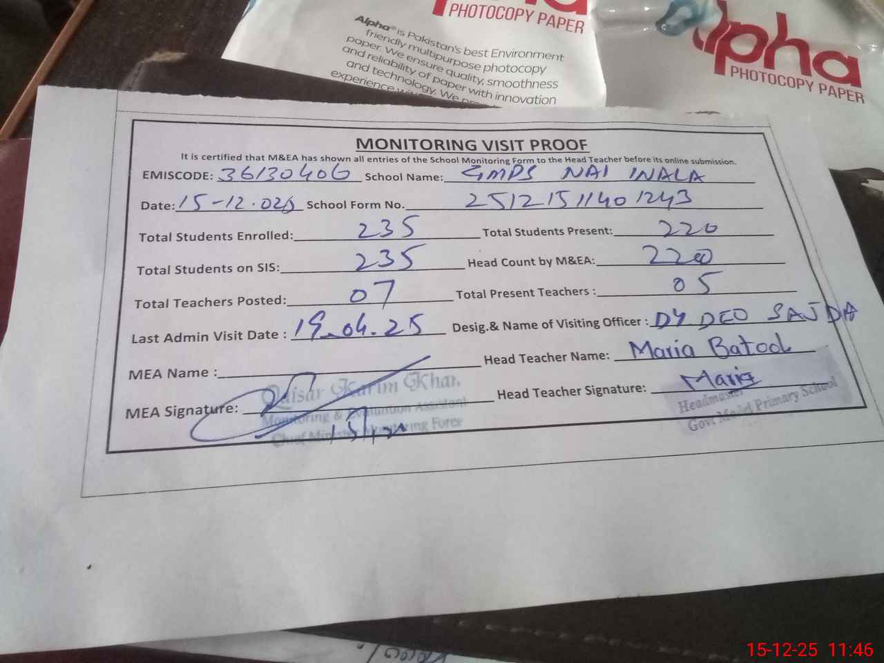 | EMIS Code: 36130406 | Name of School: GMPS NAI WALA CHAH NAZIM ABAD | |||