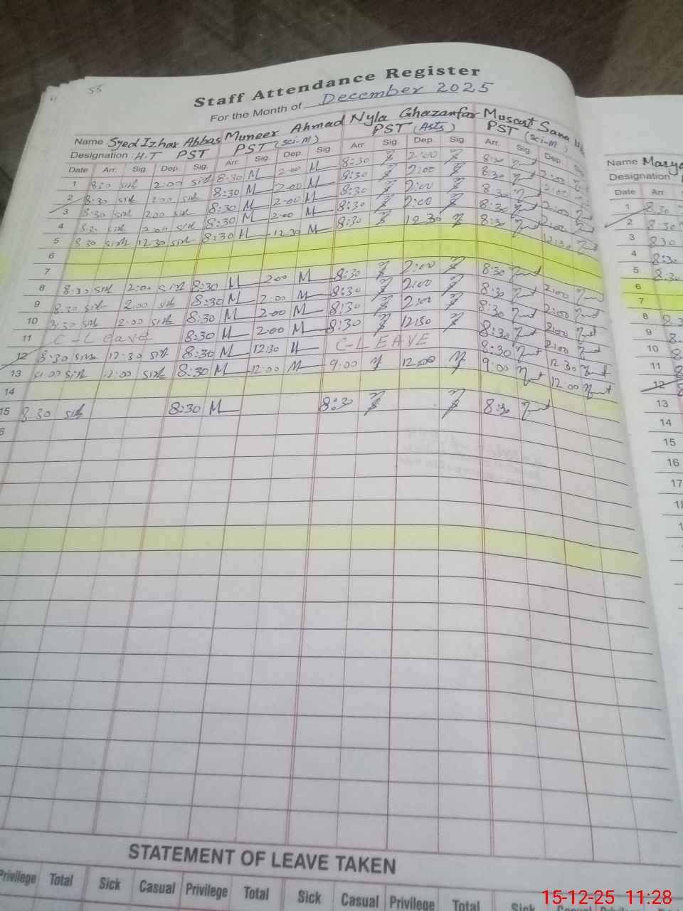 | 34**** | Ma**** Ha**** | PST Science/Maths | Regular | 0 | 0 | 0 | 0 | 0 | 0 | 0 | 0 | 0 | Maternity |