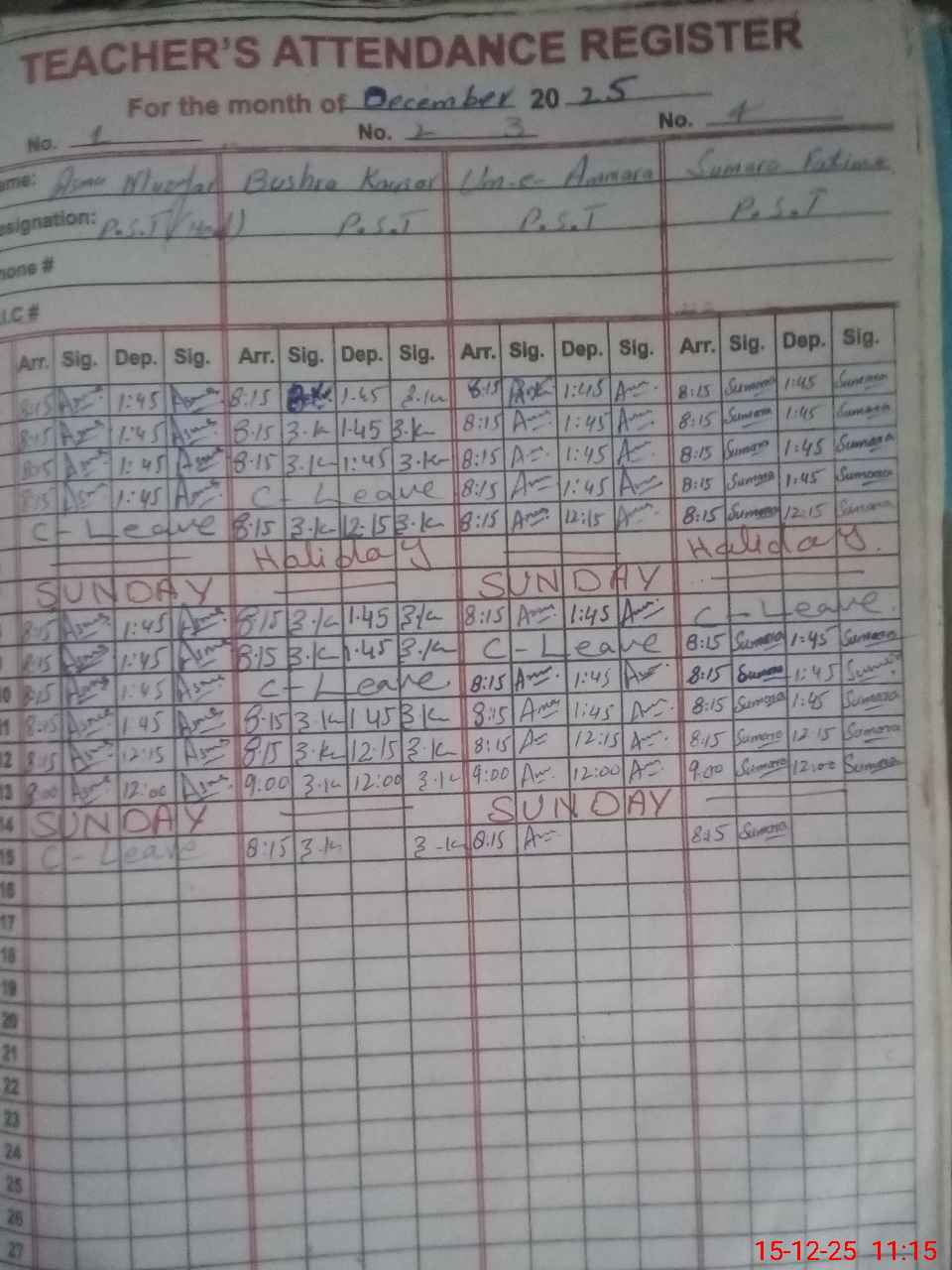 | CNIC | Full Name | Designation | R/C | Absence During Last Calender Month |