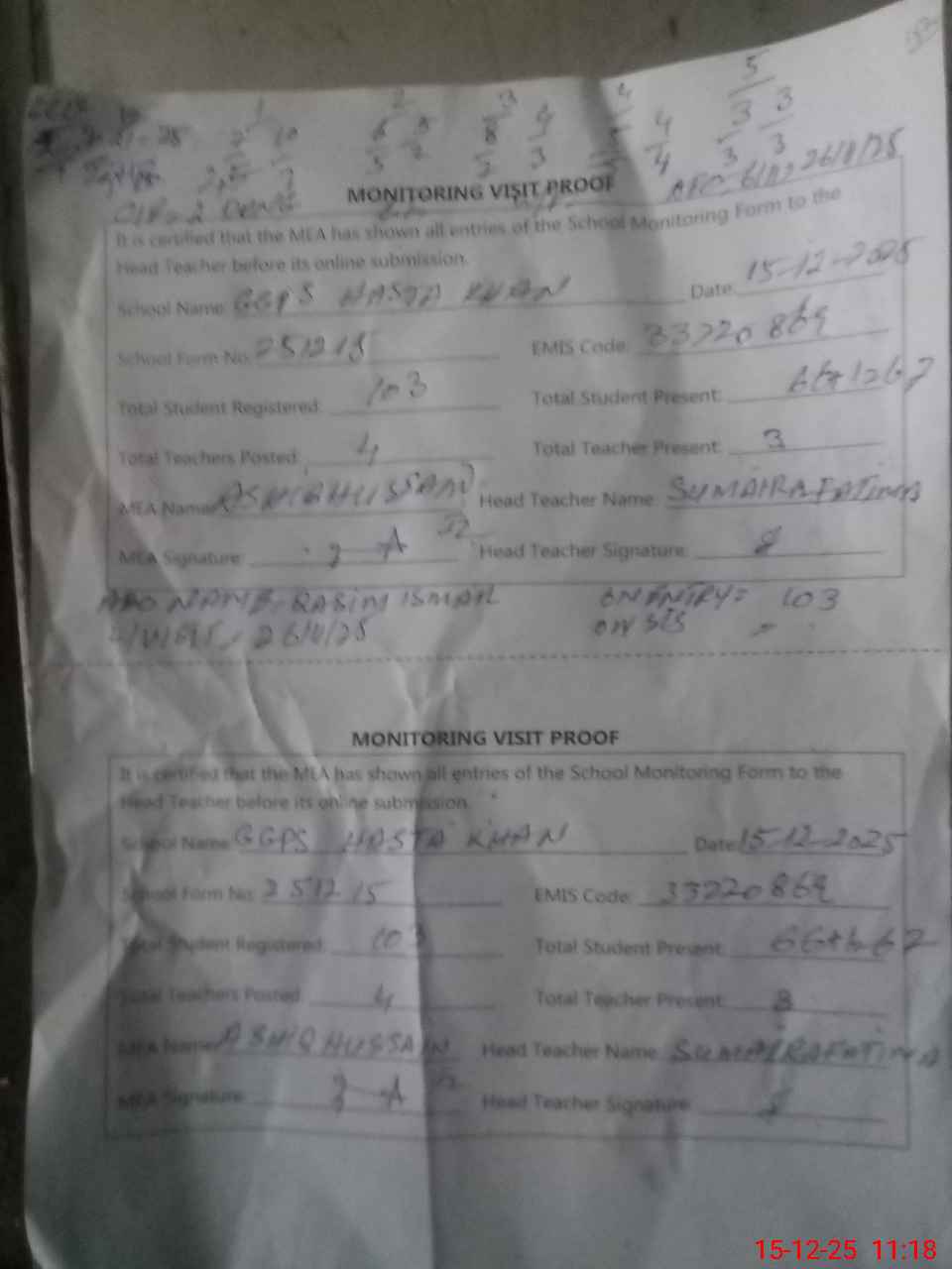 | Attendance Register | Head Teacher | MEA with School | Visit Proof |