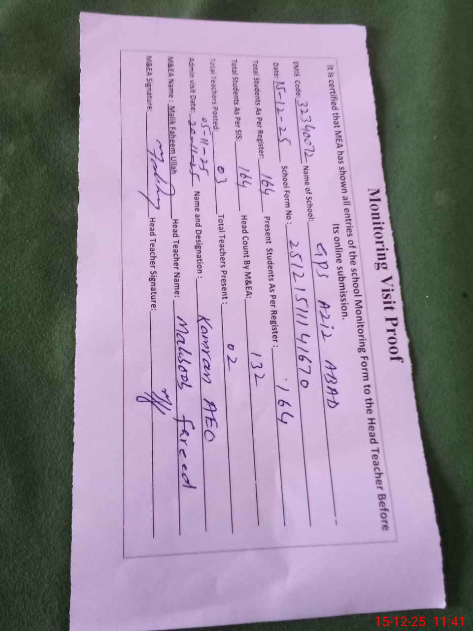 | Attendance Register | Head Teacher | MEA with School | Visit Proof |