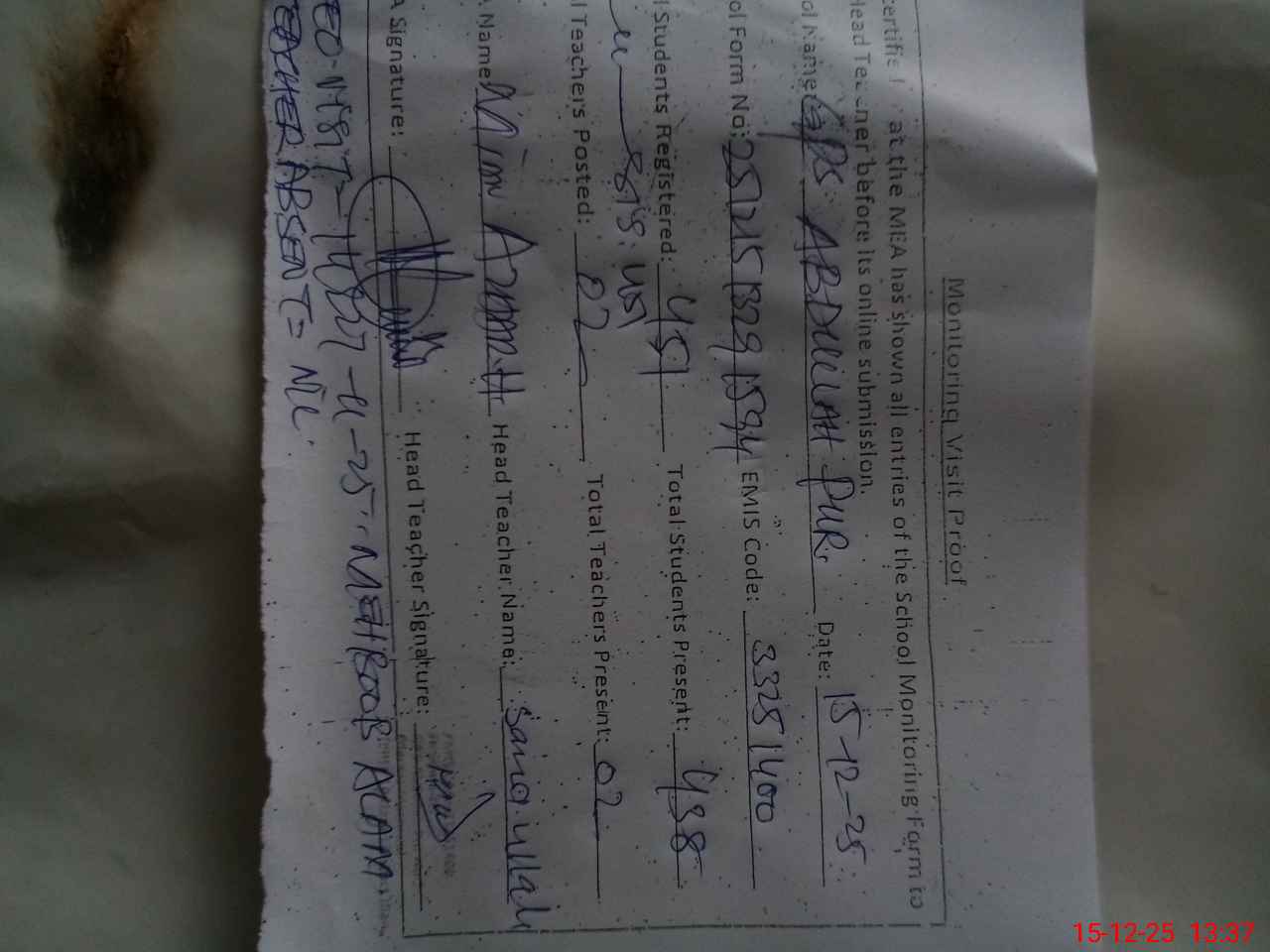 | EMIS Code: 33251400 | Name of School: GPS ABDULLAH PUR | |||
