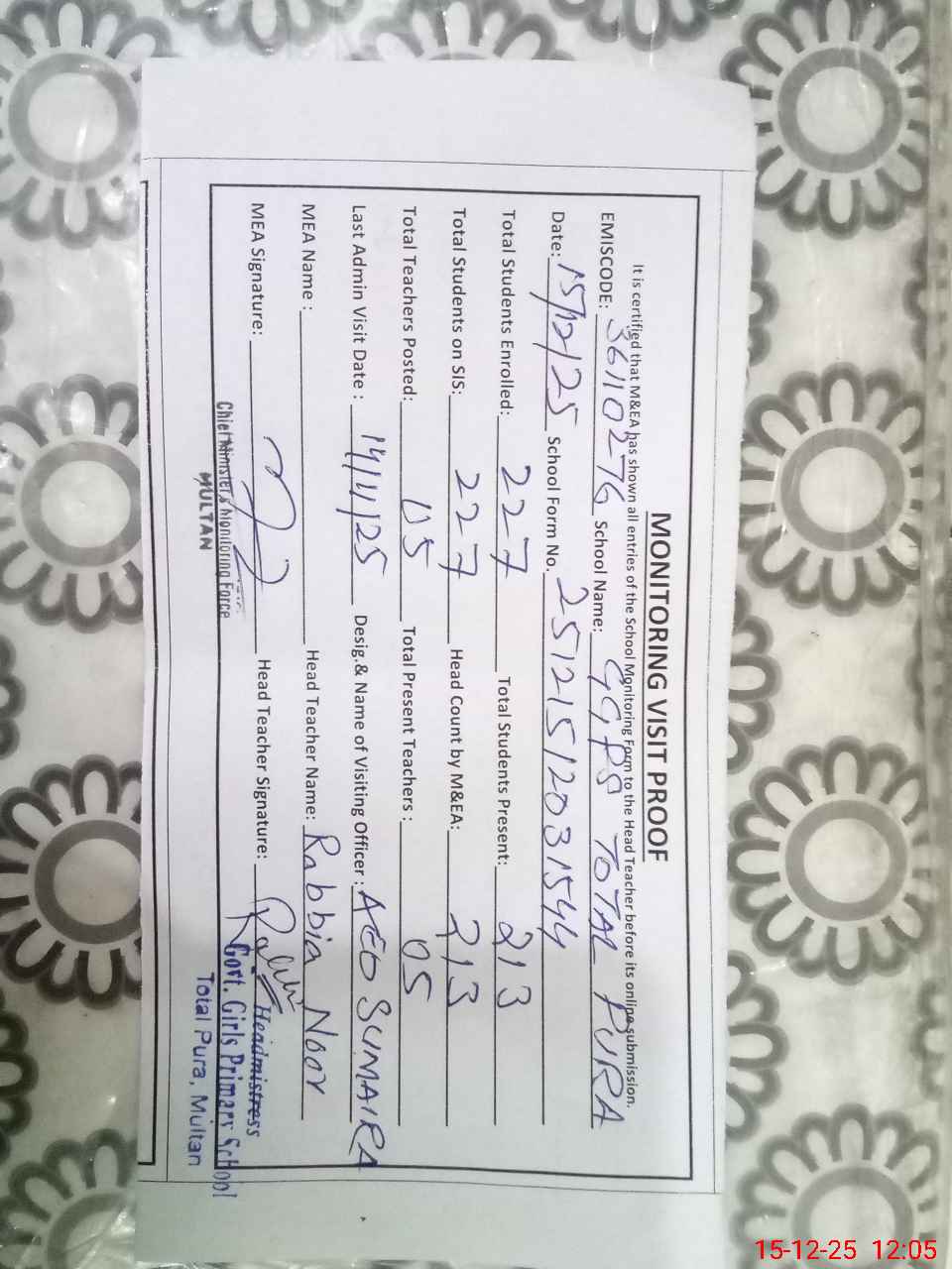 | District: MULTAN | Tehsil: MULTAN CITY | Markaz: TARAF DAIRAH - FEMALE | Level: Primary | |