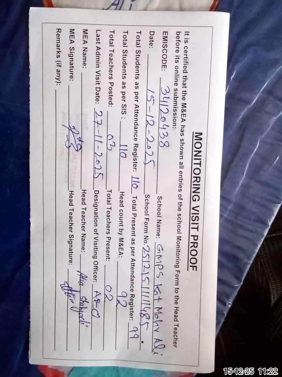 | EMIS Code: 34120438 | Name of School: GMPS KOT MEHR ALI | |||