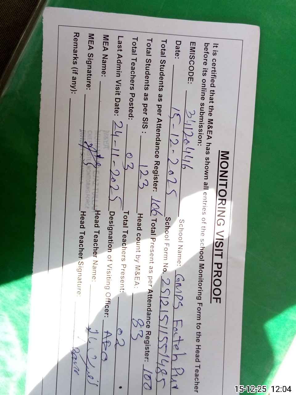 | Attendance Register | Head Teacher | MEA with School | Visit Proof |