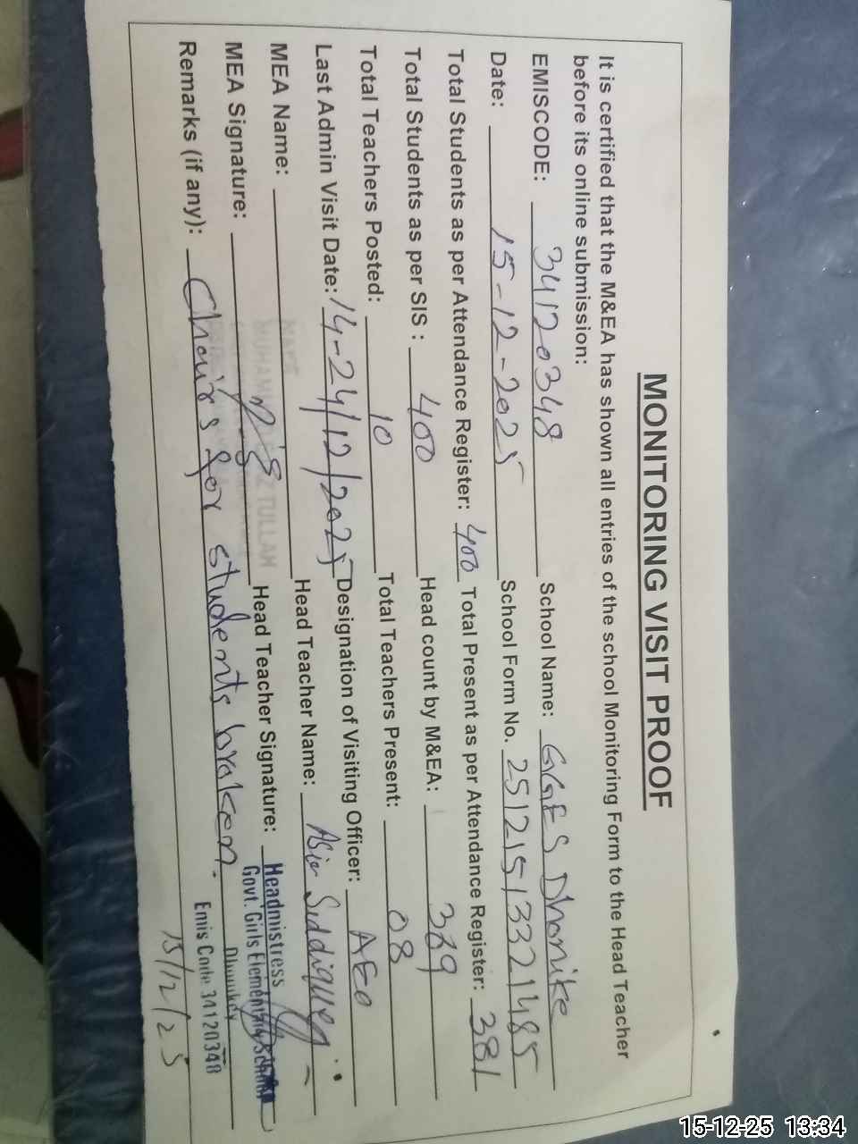 | Attendance Register | Head Teacher | MEA with School | Visit Proof |