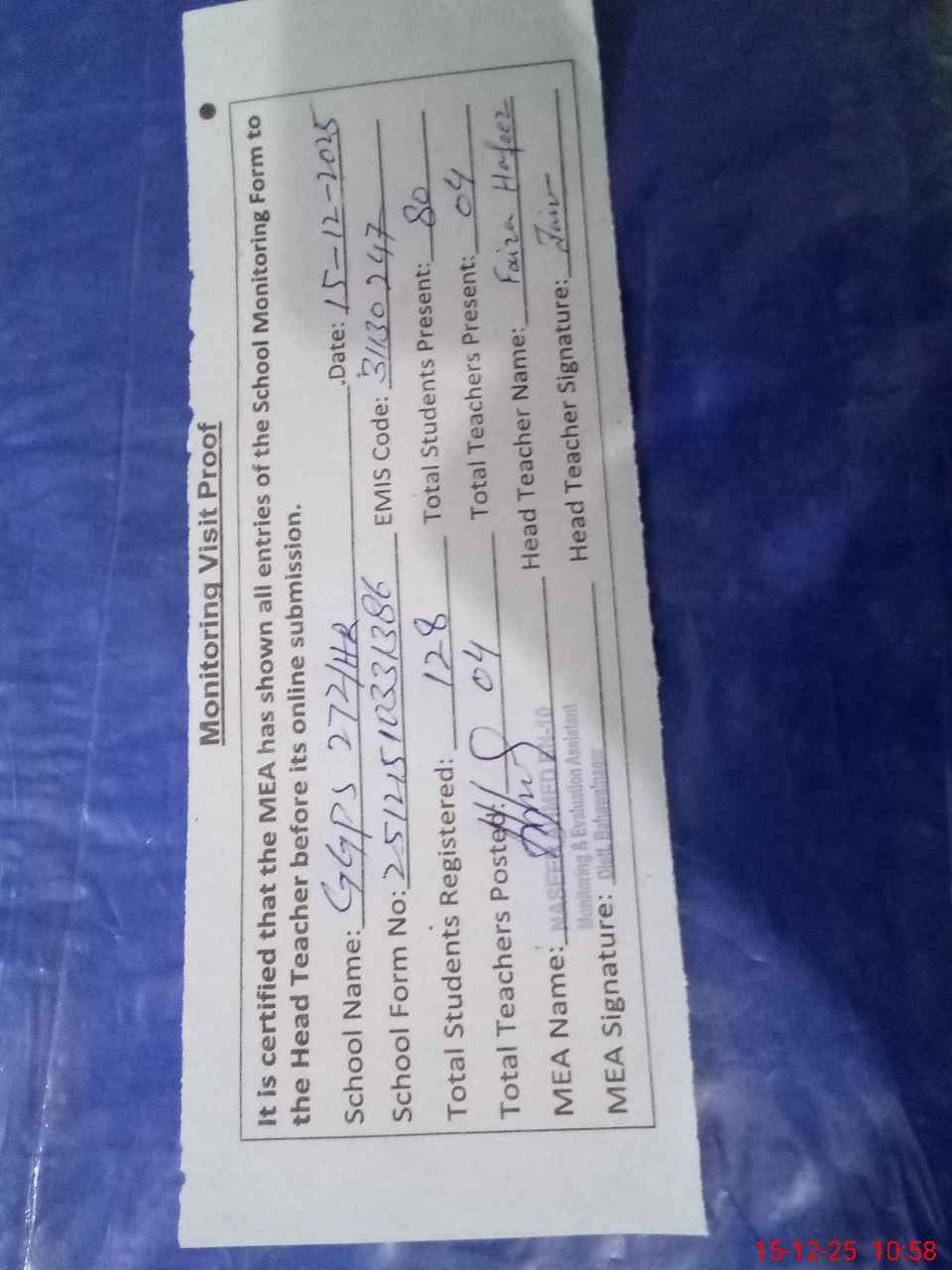 | Attendance Register | Head Teacher | MEA with School | Visit Proof |