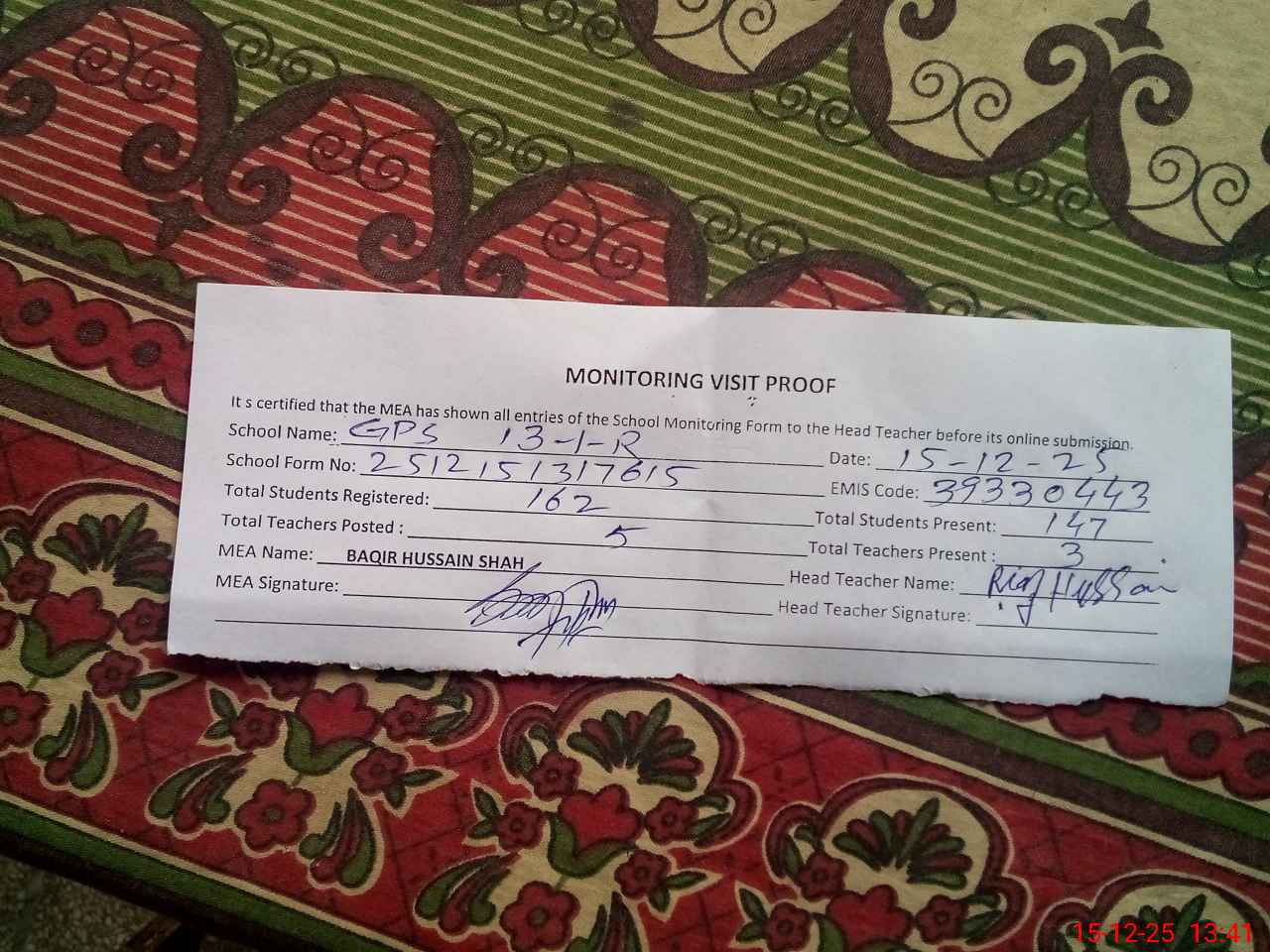 | EMIS Code: 39330443 | Name of School: GPS CHAK NO.13/1-RA | |||