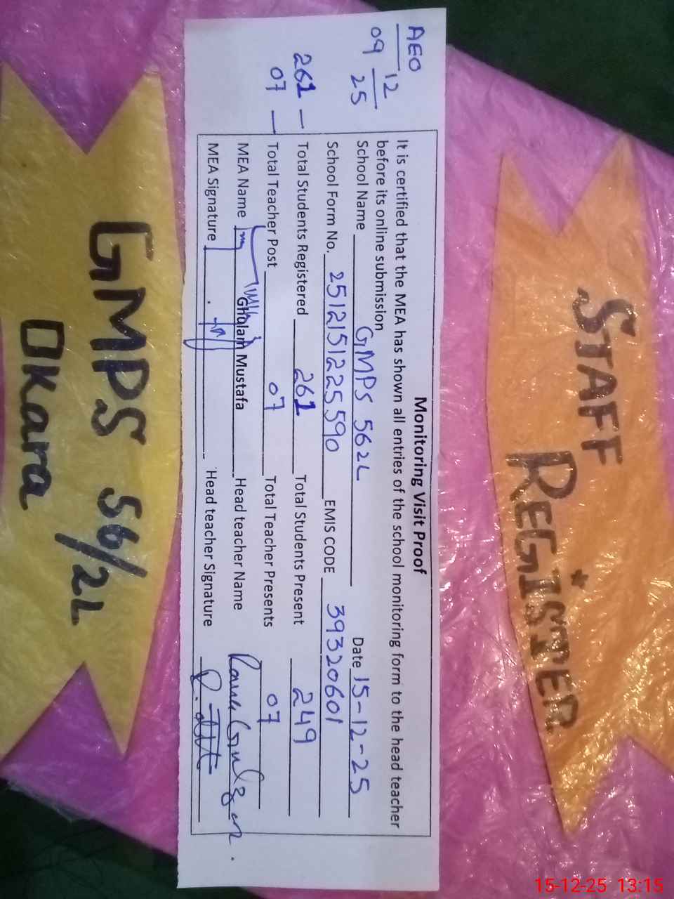 | Attendance Register | Head Teacher | MEA with School | Visit Proof |