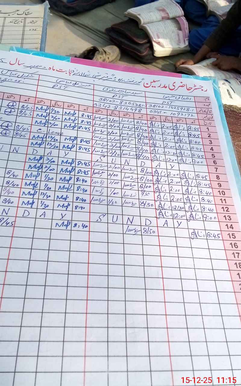 | CNIC | Full Name | Designation | R/C | Absence During Last Calender Month |