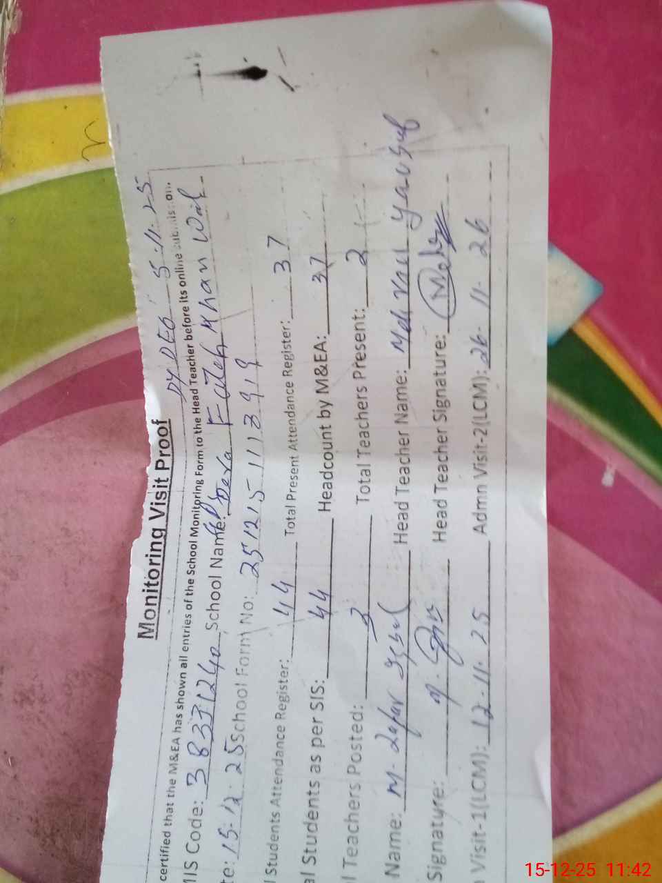 | Attendance Register | Head Teacher | MEA with School | Visit Proof |