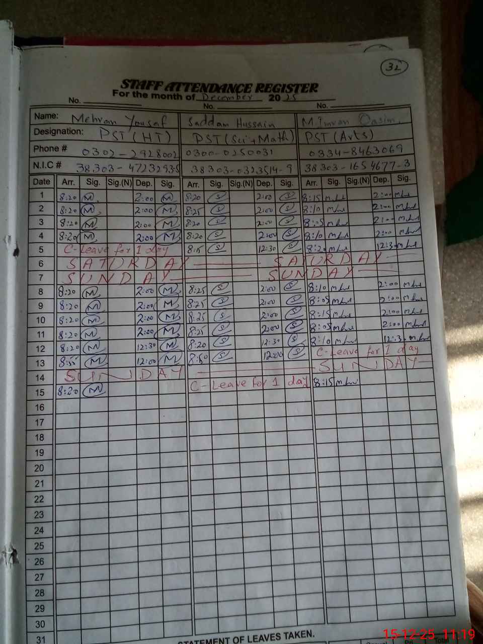 | CNIC | Full Name | Designation | R/C | Absence During Last Calender Month |