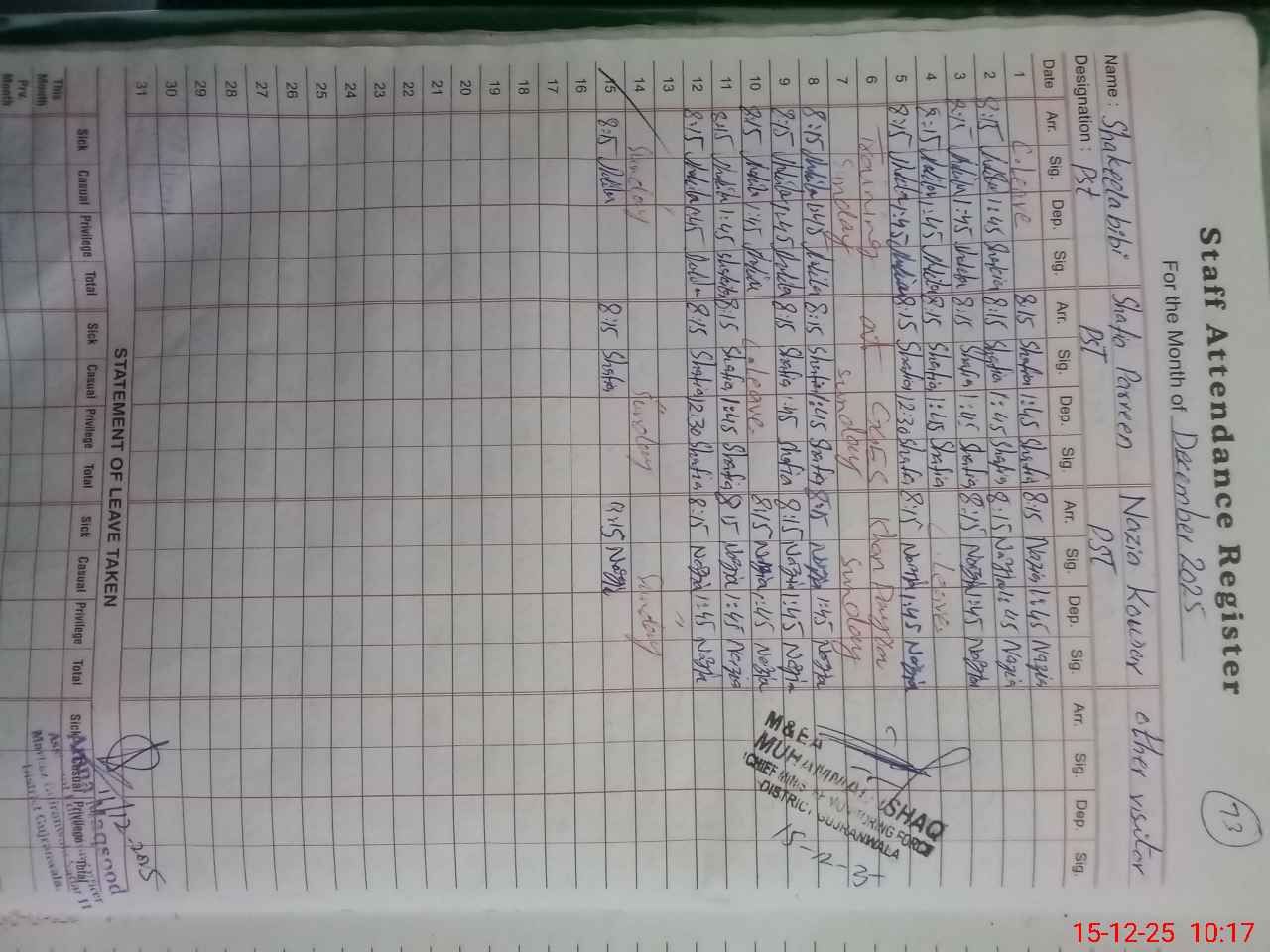 | Name: SH**** BI**** Designation: (School Headmaster's/Headmistress's) PST Phone/Cell Number: 03**** |