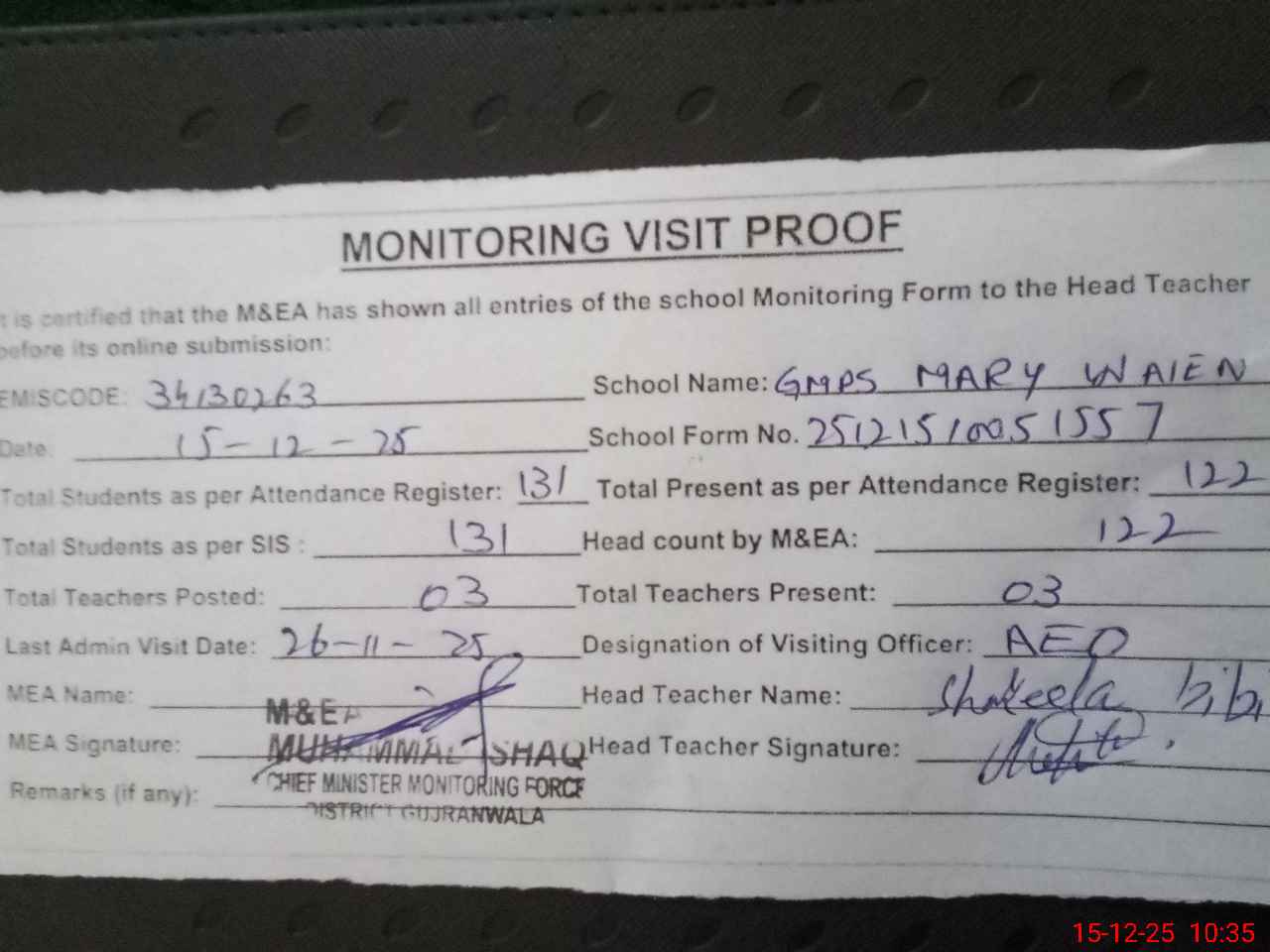 | Attendance Register | Head Teacher | MEA with School | Visit Proof |