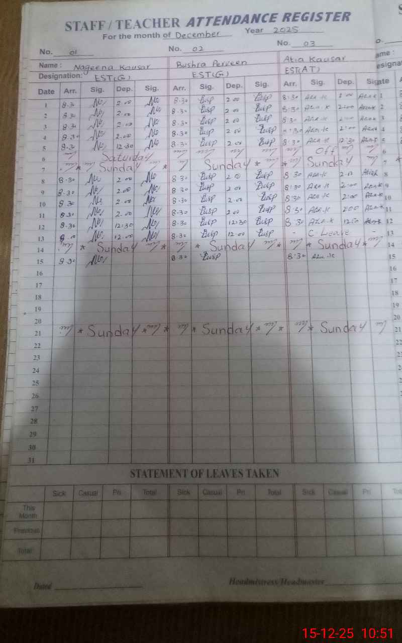 | CNIC | Full Name | Designation | R/C | Absence During Last Calender Month |