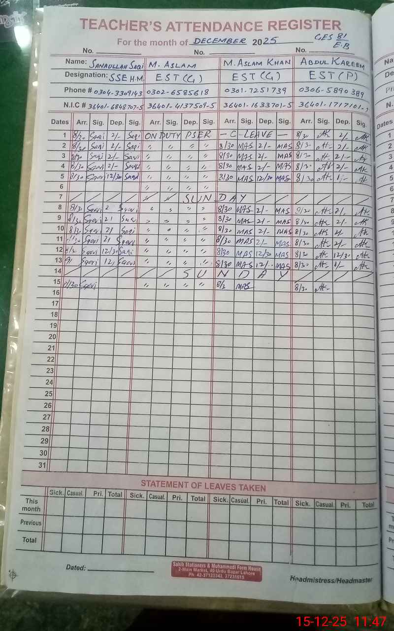 | CNIC | Full Name | Designation | R/C | Absence During Last Calender Month |