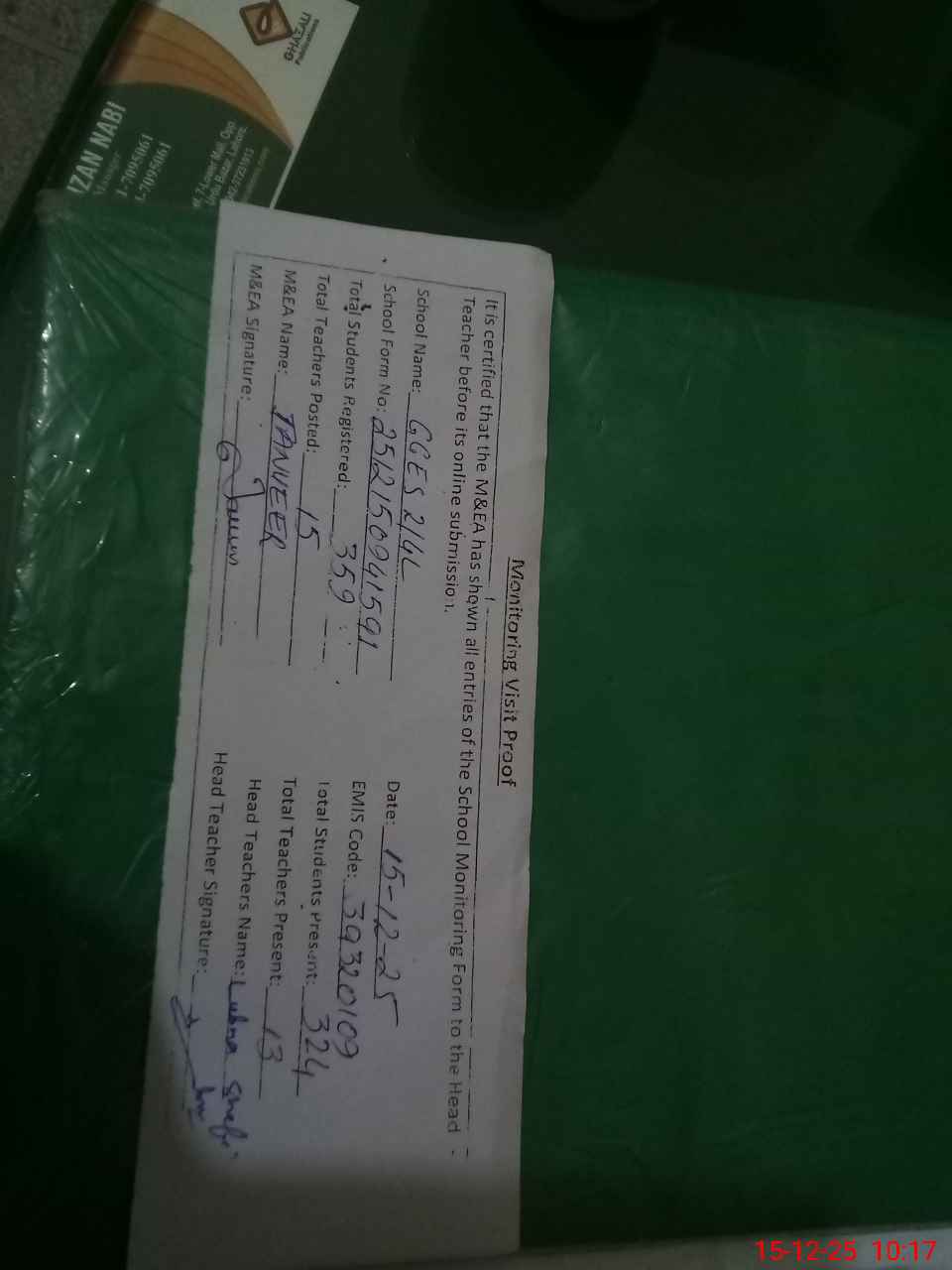| Attendance Register | Head Teacher | MEA with School | Visit Proof |