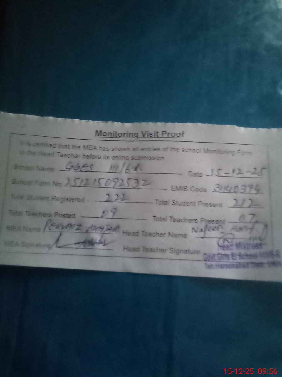 | Attendance Register | Head Teacher | MEA with School | Visit Proof |