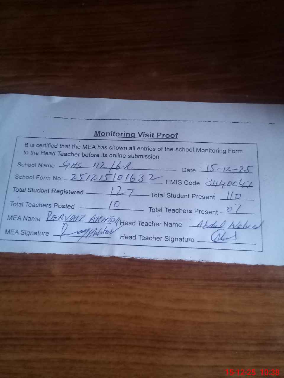 | Attendance Register | Head Teacher | MEA with School | Visit Proof |