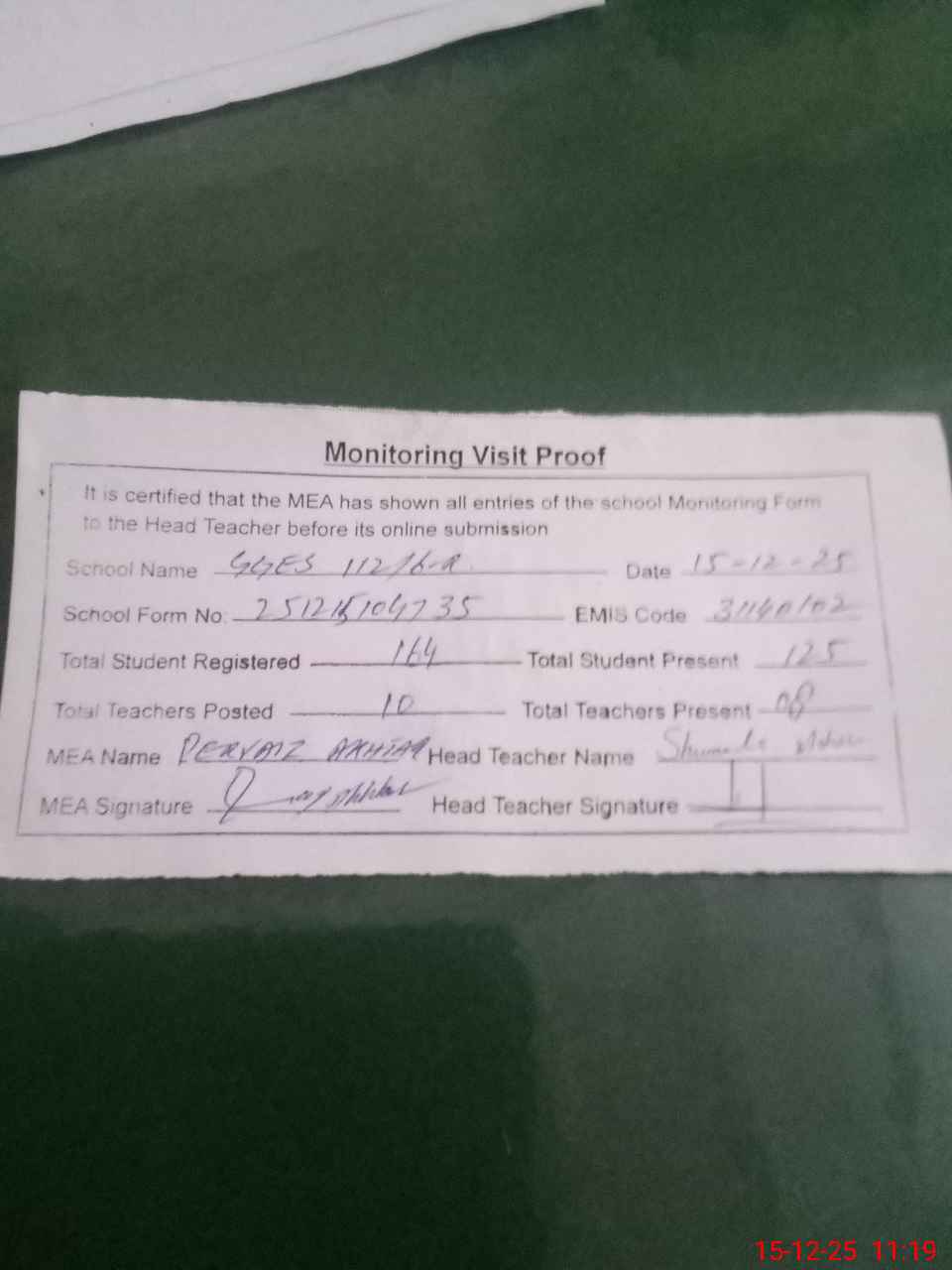 | Attendance Register | Head Teacher | MEA with School | Visit Proof |
