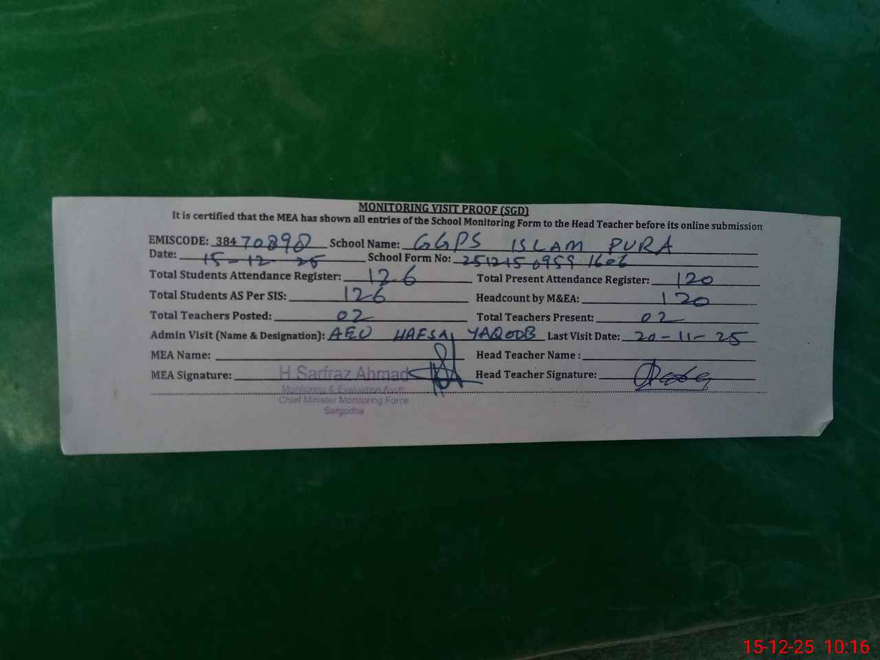| Attendance Register | Head Teacher | MEA with School | Visit Proof |