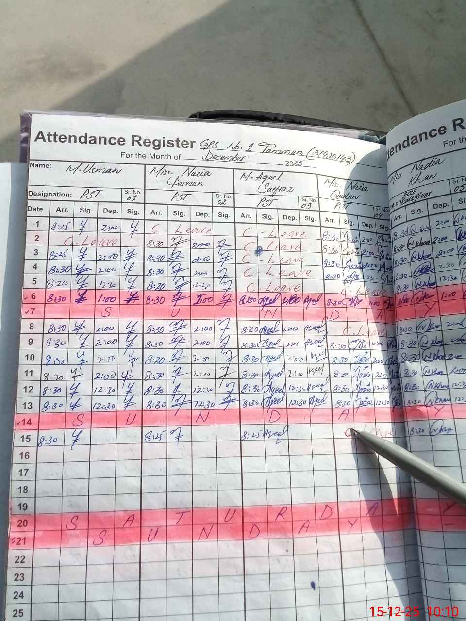 | CNIC | Full Name | Designation | R/C | Absence During Last Calender Month |