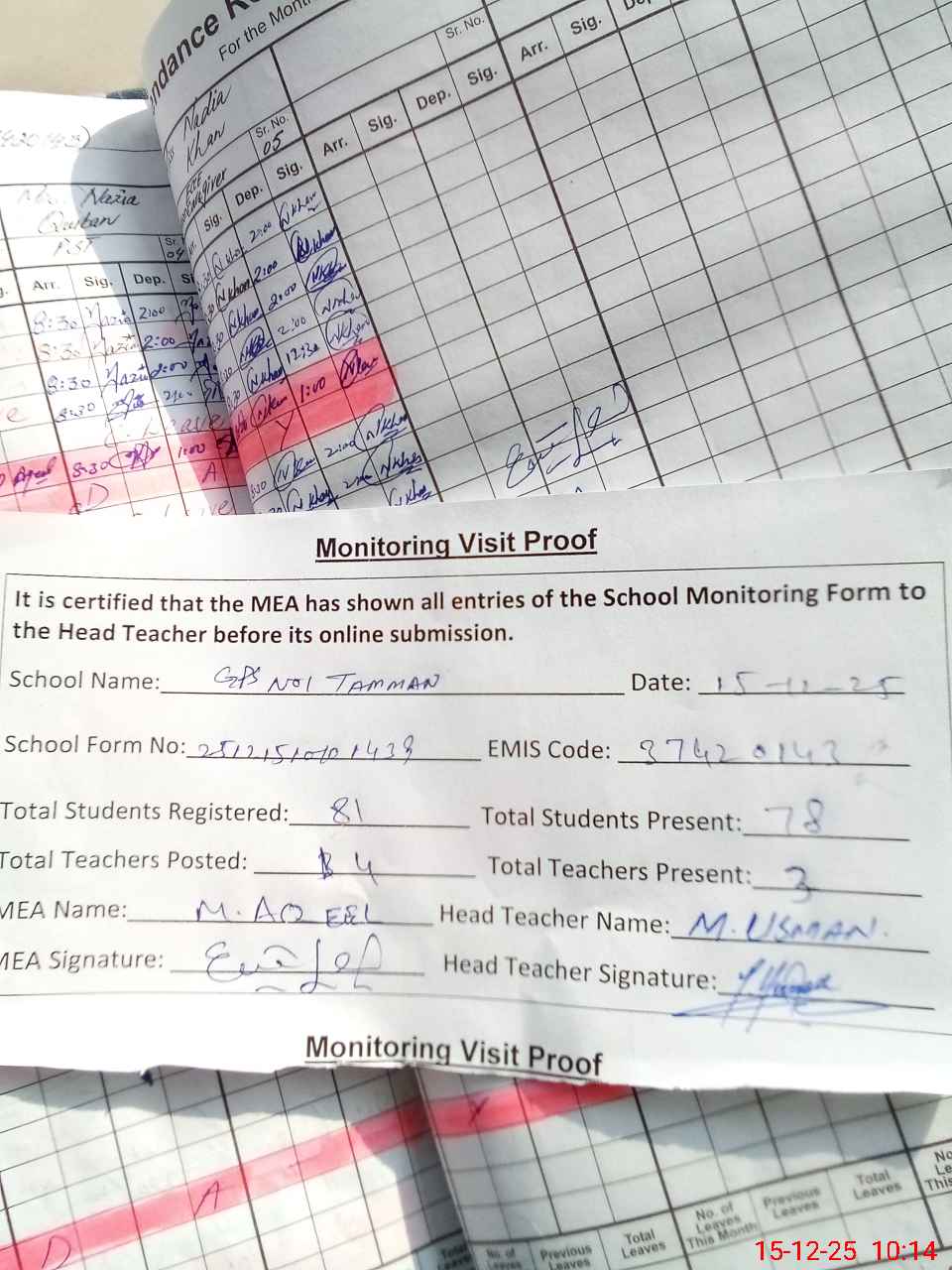 | Attendance Register | Head Teacher | MEA with School | Visit Proof |