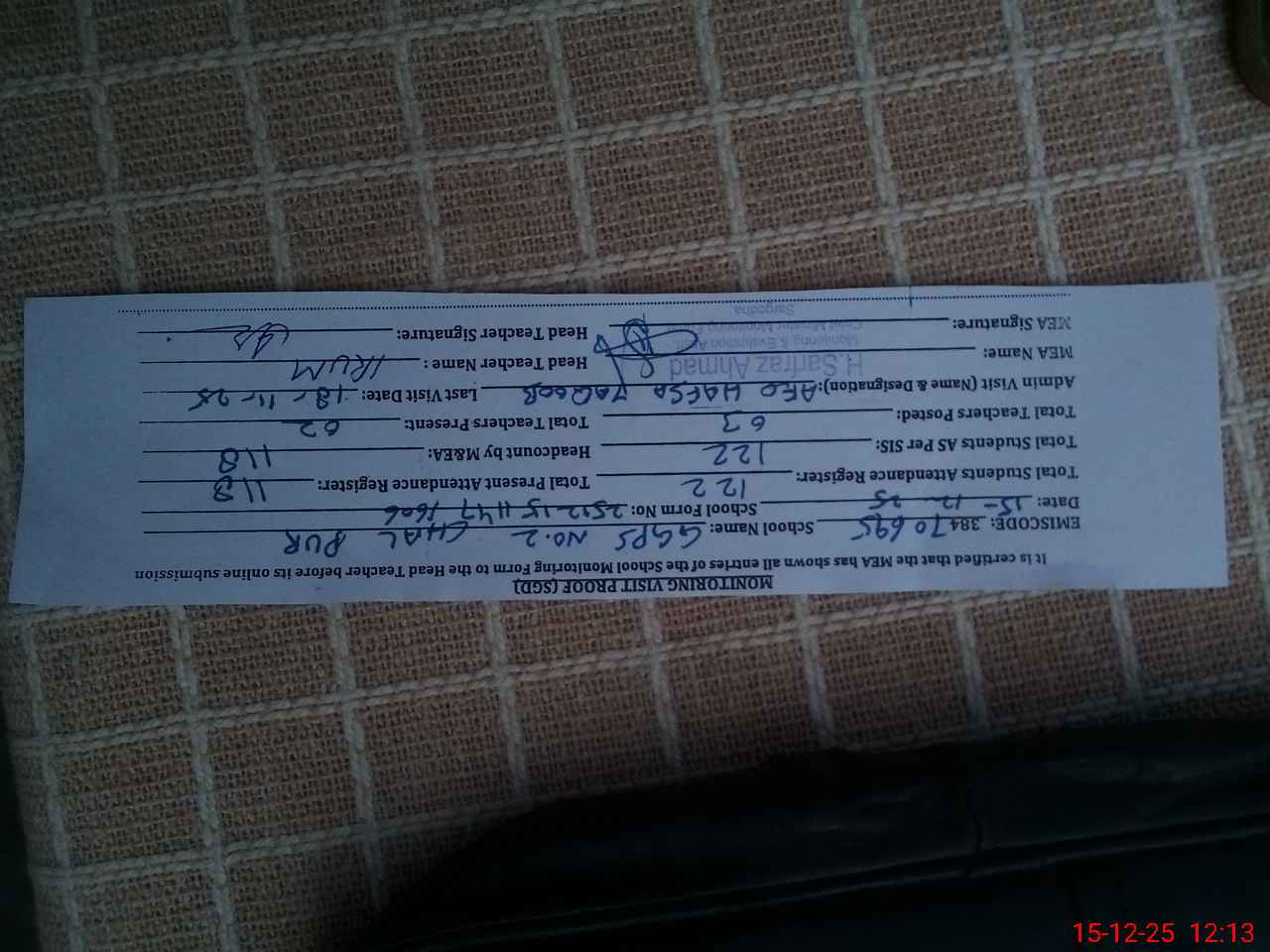 | Attendance Register | Head Teacher | MEA with School | Visit Proof |