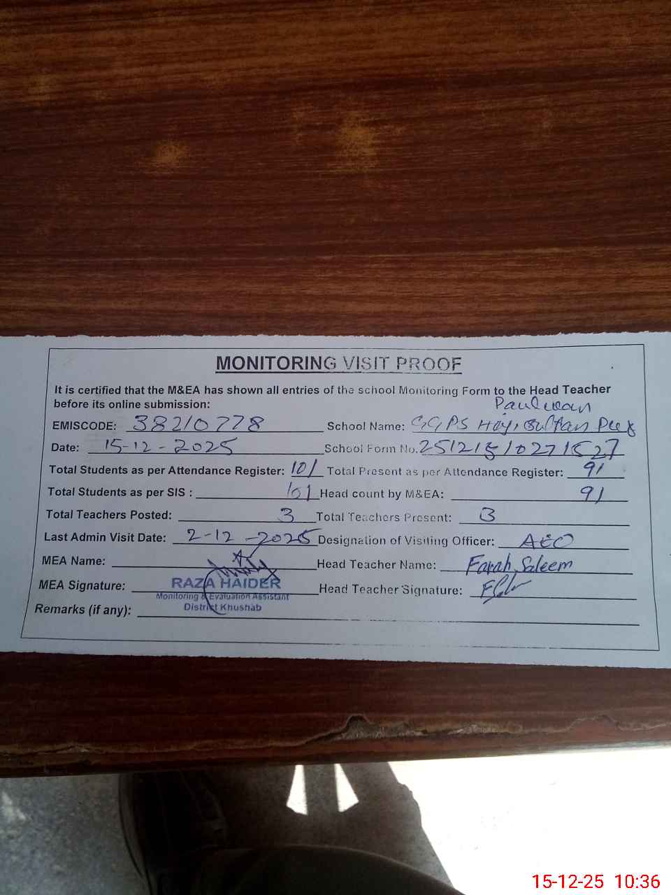 | Attendance Register | Head Teacher | MEA with School | Visit Proof |