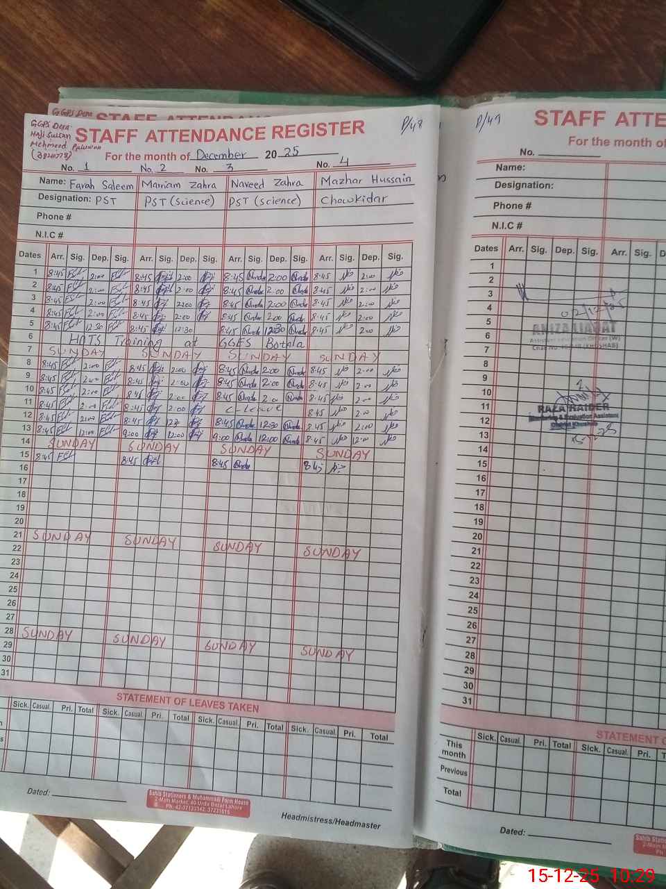 | CNIC | Full Name | Designation | R/C | Absence During Last Calender Month |