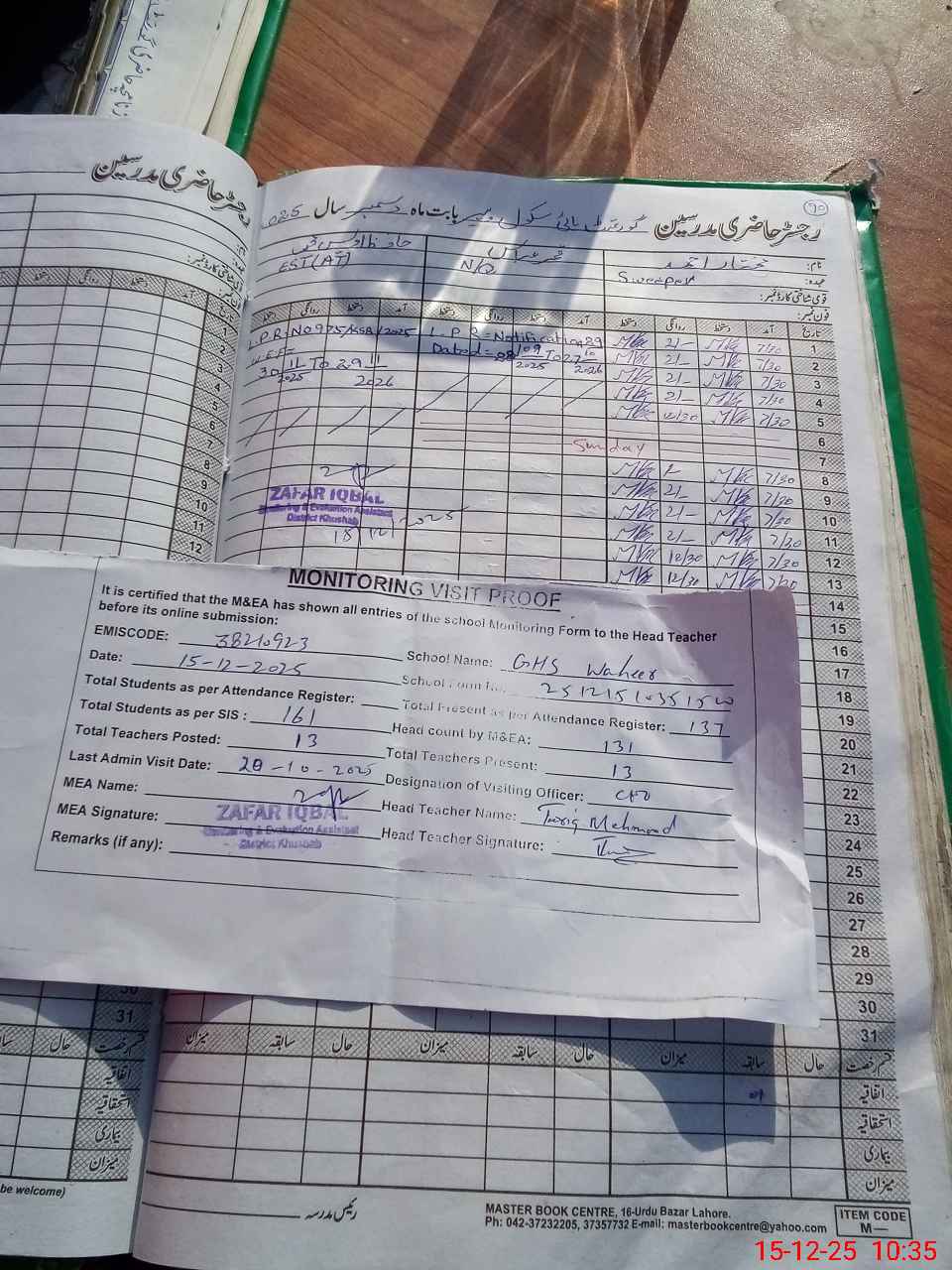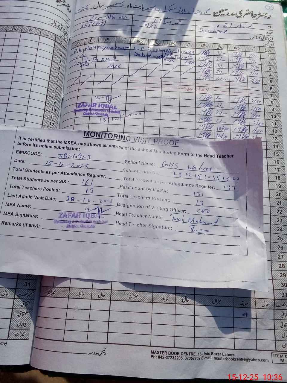 | Attendance Register | Head Teacher | MEA with School | Visit Proof |