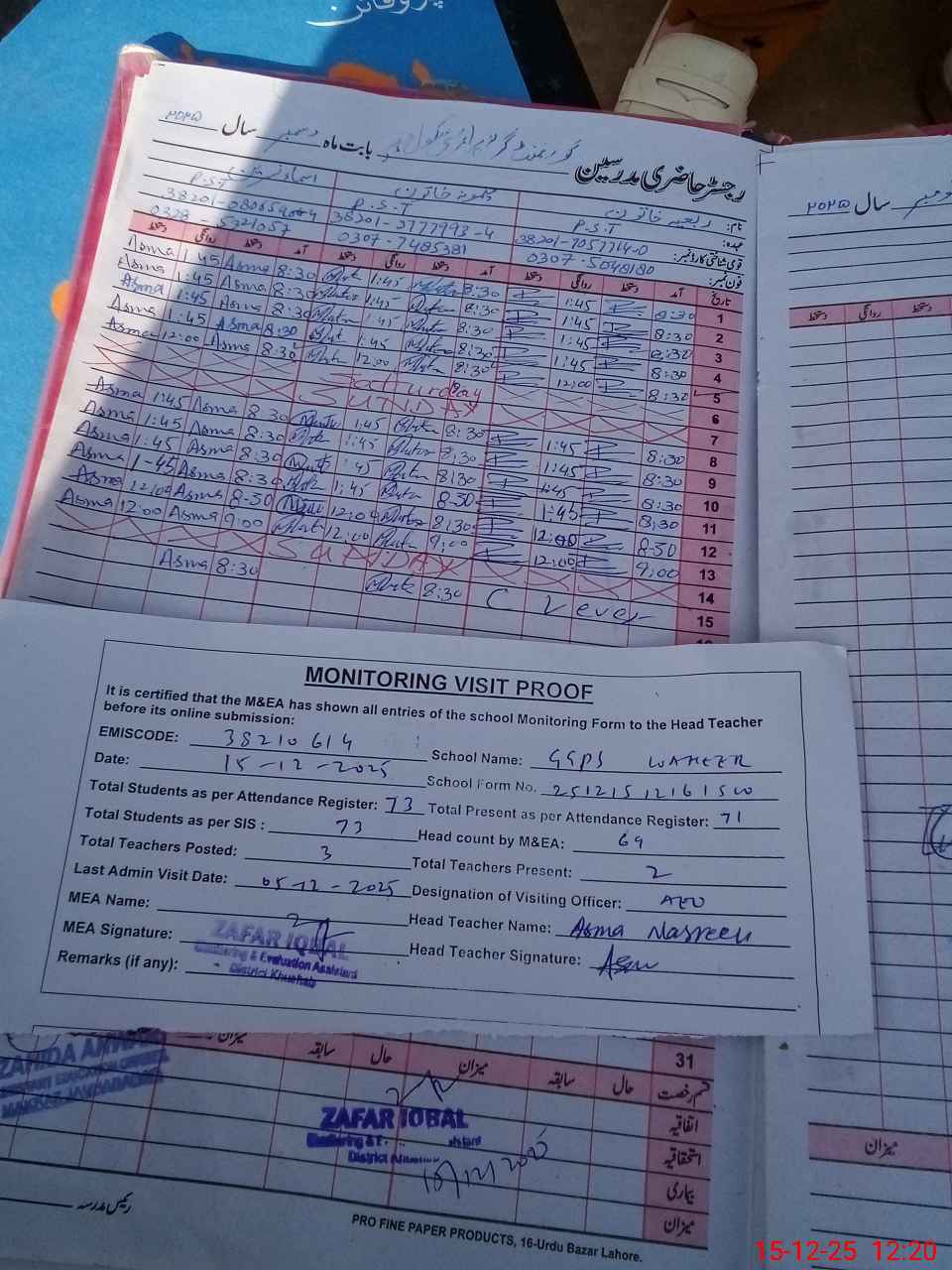 | Attendance Register | Head Teacher | MEA with School | Visit Proof |