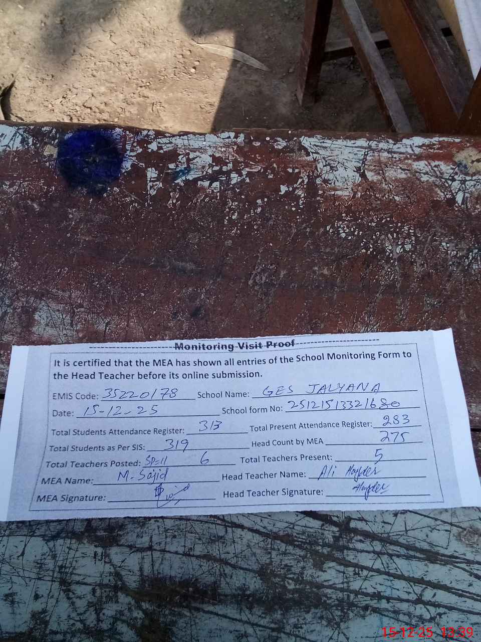 | Attendance Register | Head Teacher | MEA with School | Visit Proof |