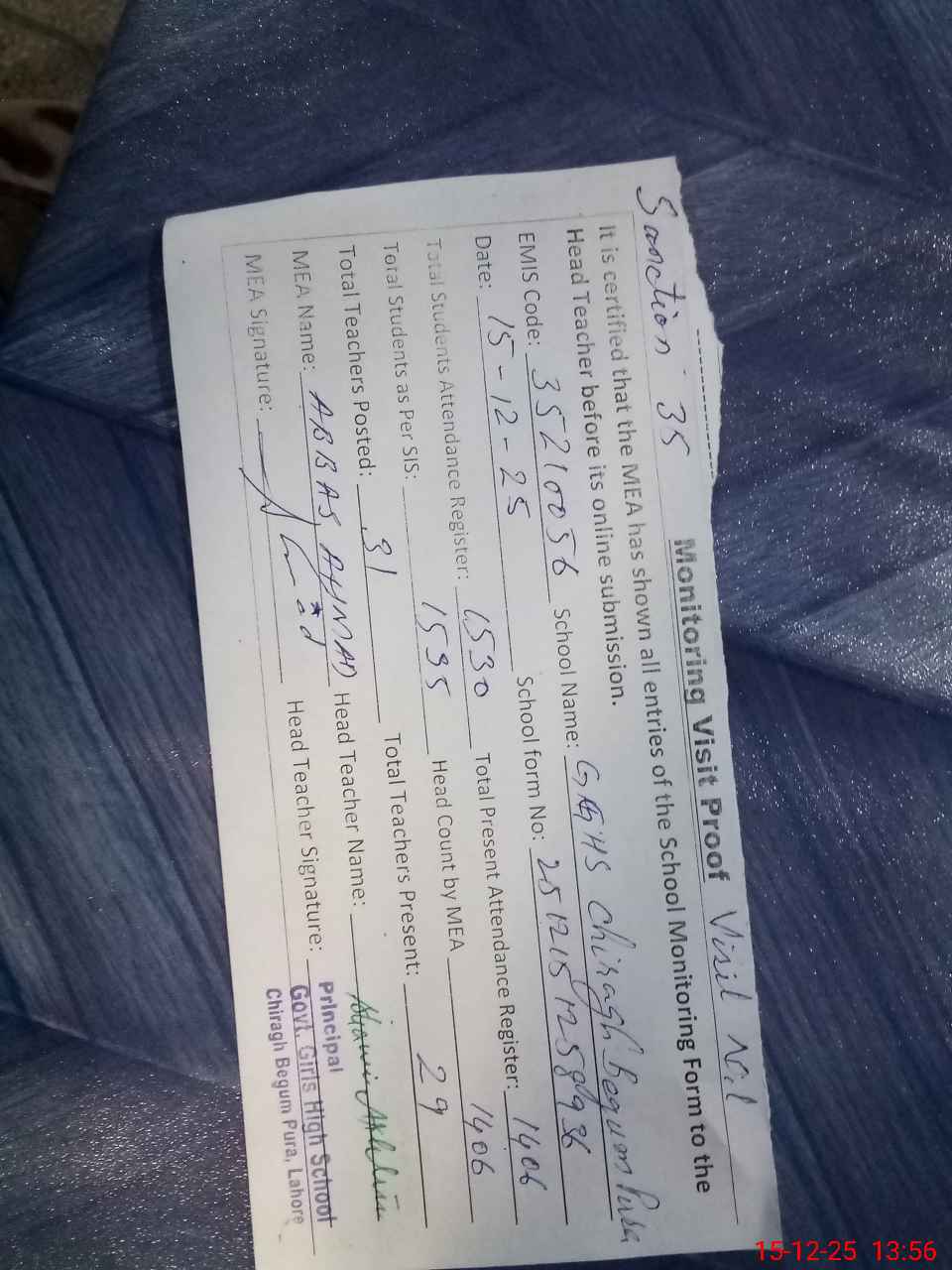 | EMIS Code: 35210056 | Name of School: GGHS CHIRAGH BEGUM PURA | |||