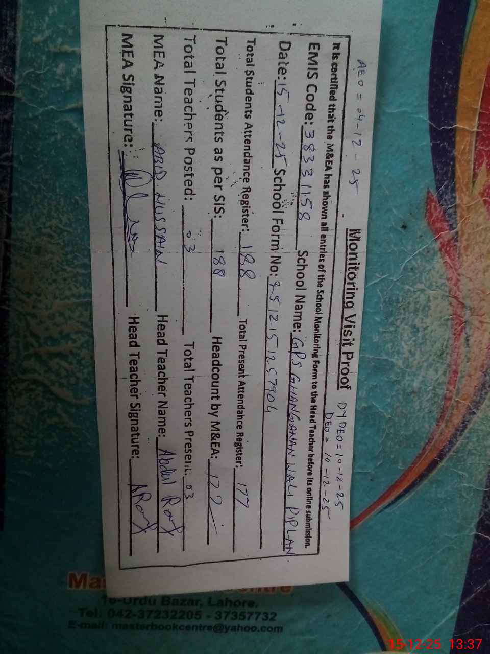 | Attendance Register | Head Teacher | MEA with School | Visit Proof |