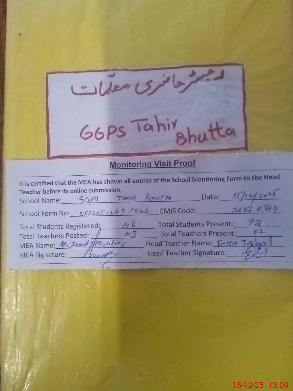| EMIS Code: 36630344 | Name of School: GGPS TAHIR BHUTTA | |||