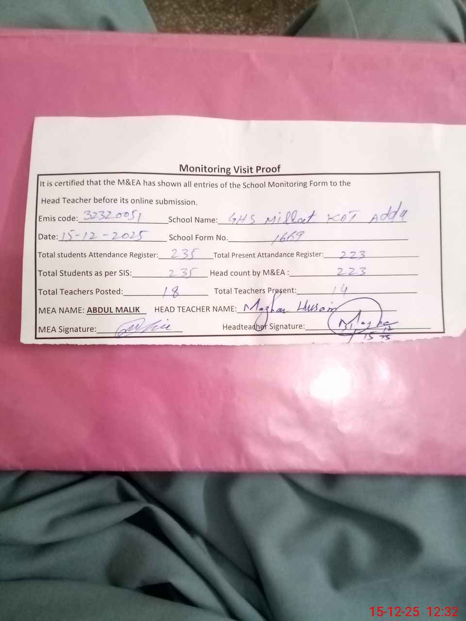 | Attendance Register | Head Teacher | MEA with School | Visit Proof |