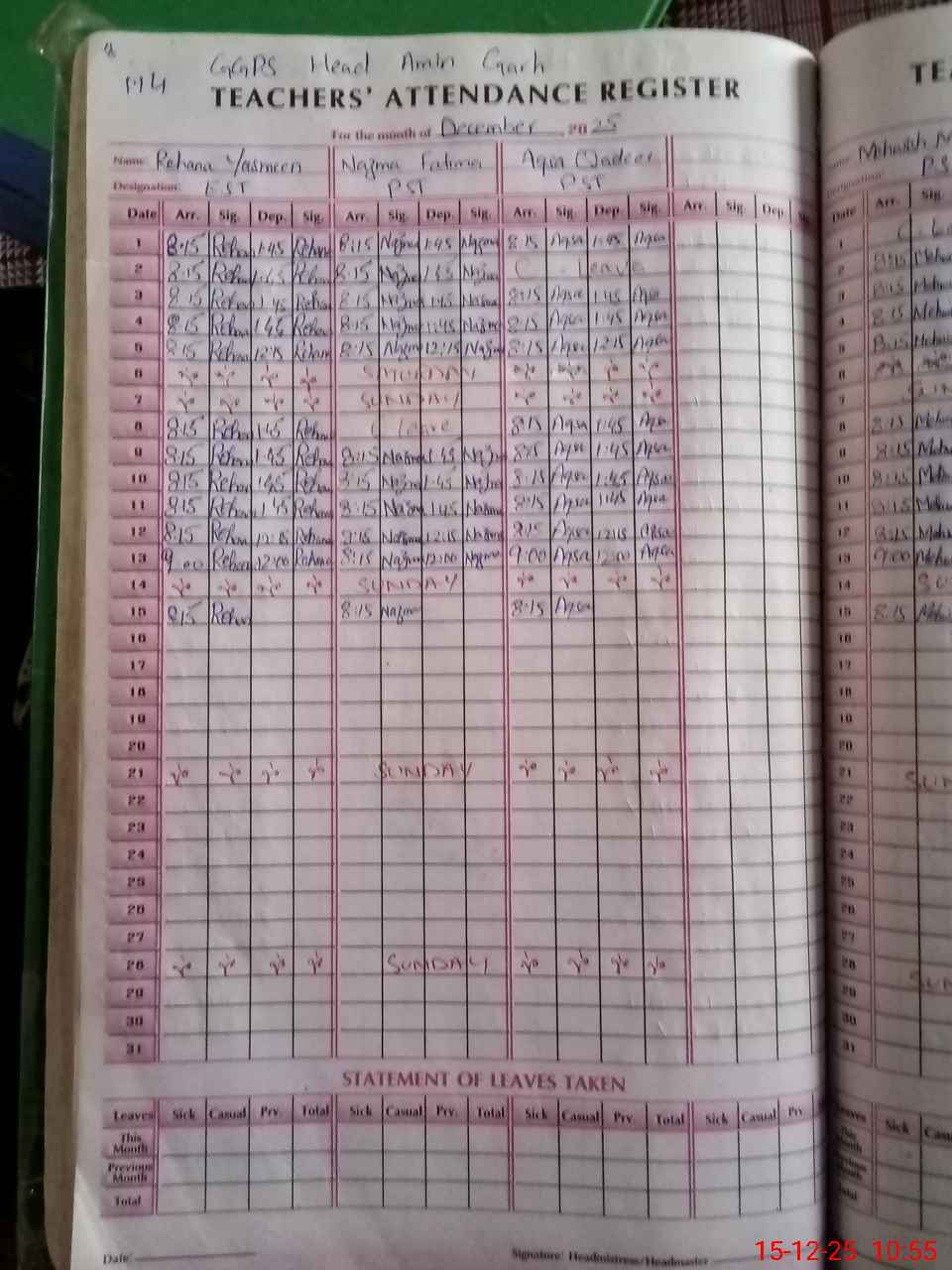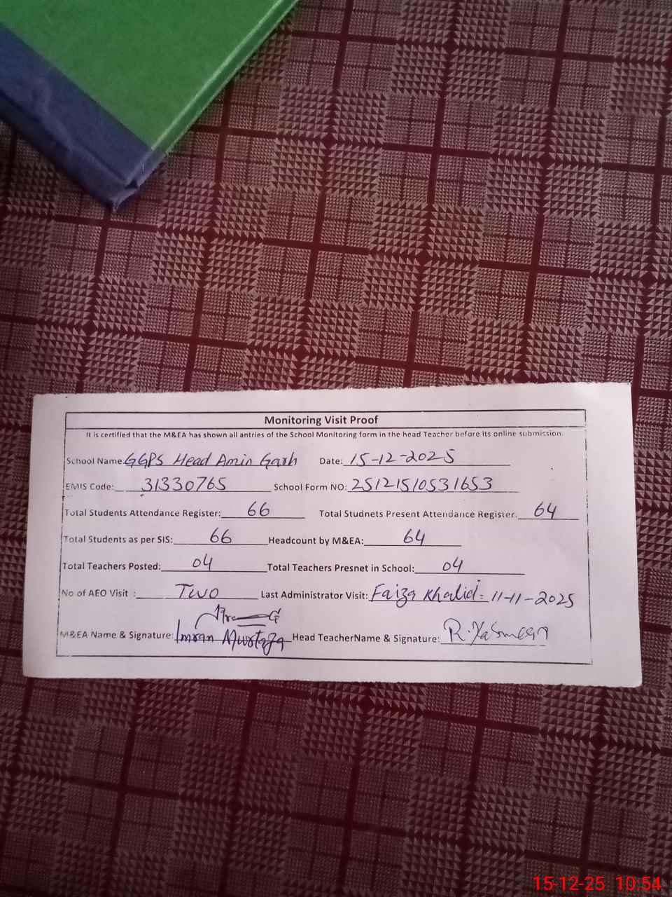 | Attendance Register | Head Teacher | MEA with School | Visit Proof |