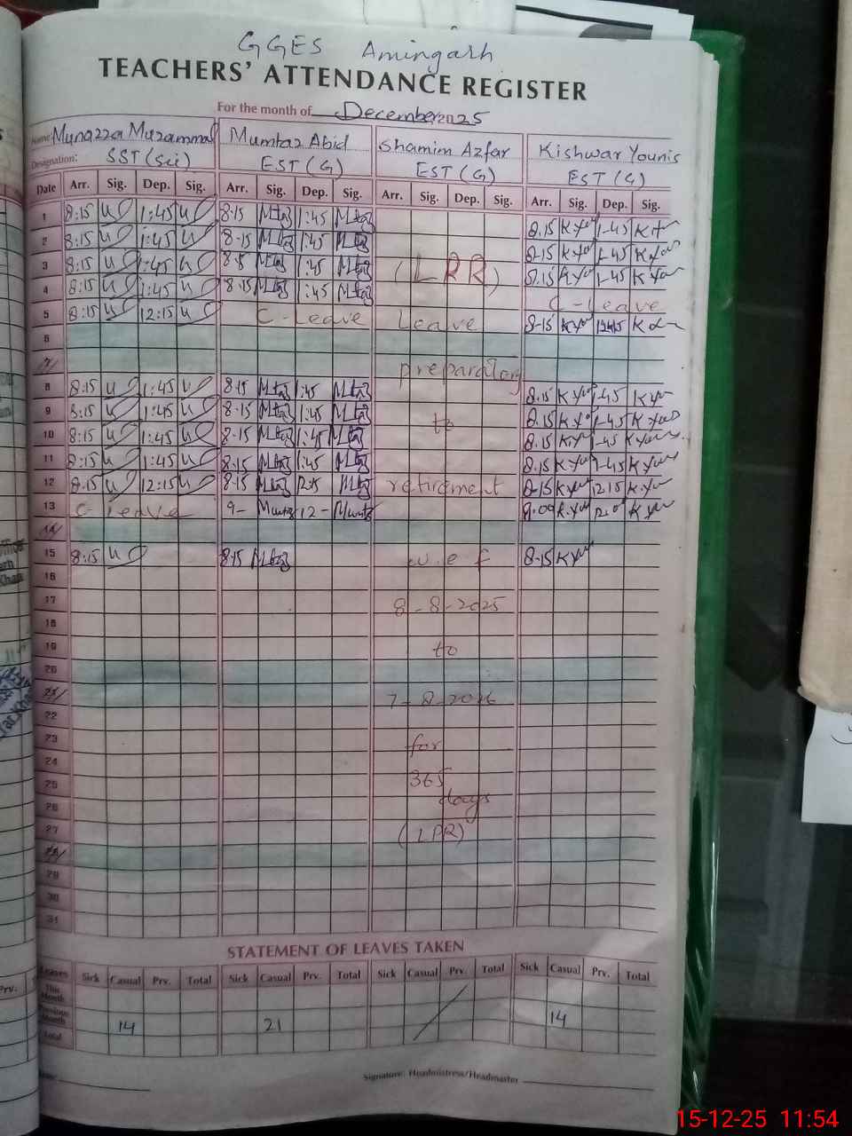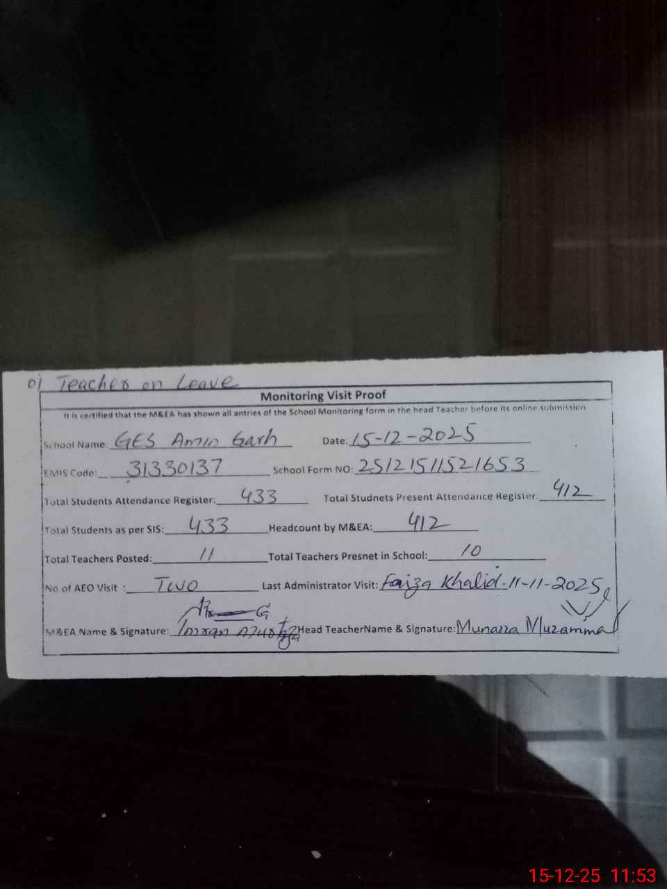 | Attendance Register | Head Teacher | MEA with School | Visit Proof |