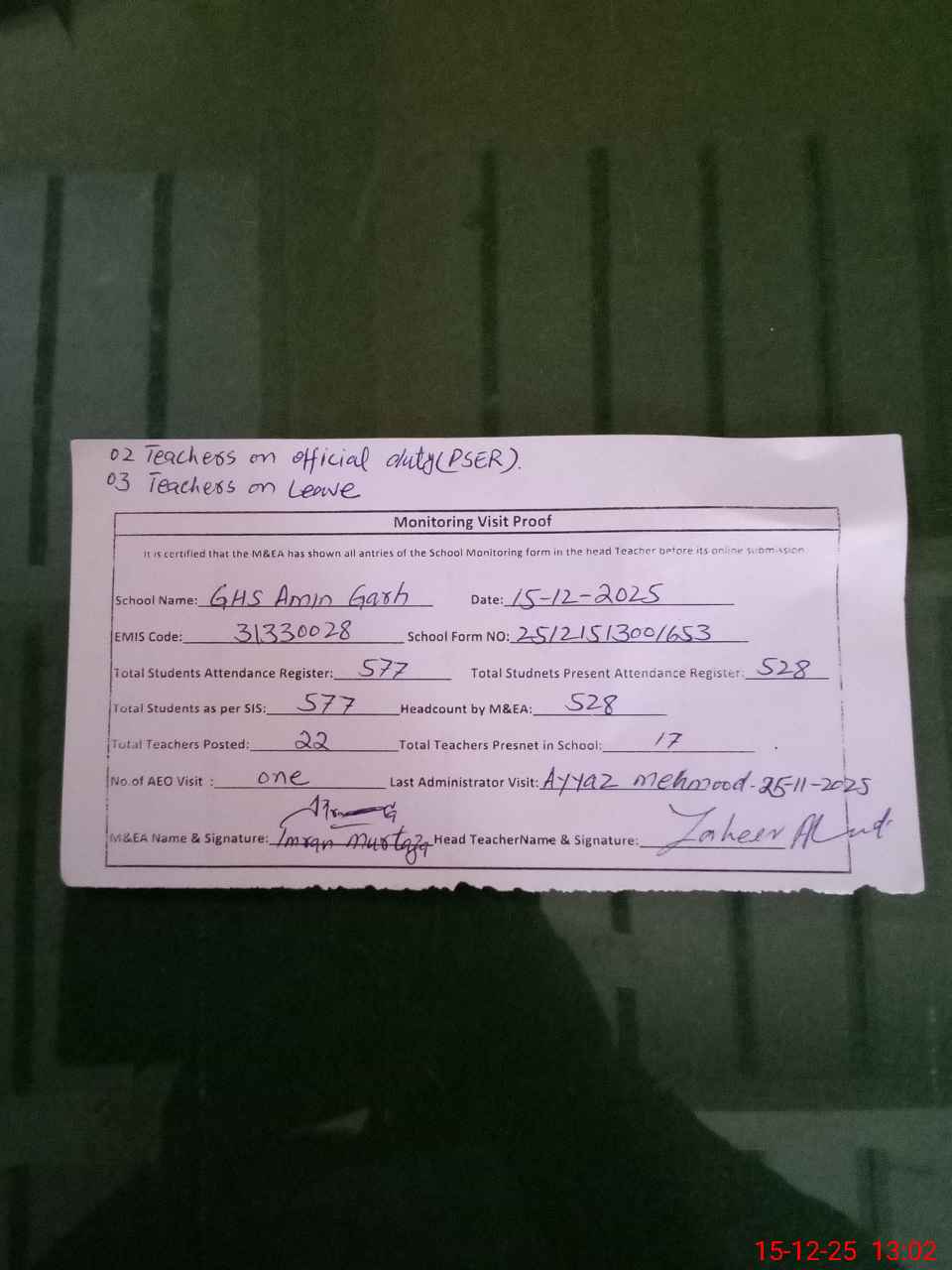 | Attendance Register | Head Teacher | MEA with School | Visit Proof |