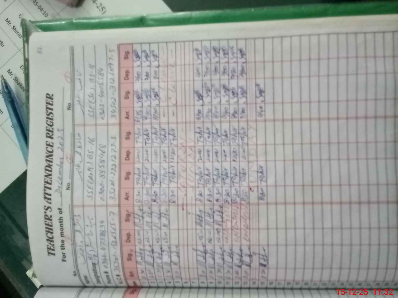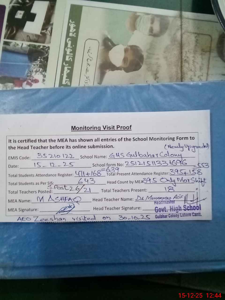 | Remarks (Use Separate Page if Required): Security Guard Muhammad Khalid Pervaiz on Polio duty but his written Orders not available so mark him absent Teachers Sanctioned Post 26 and Filled 21 AEO Zeeshan visited on 30-10-25 Classes 1 and 5 attendance register shown blank on 12 December 25 not attendance maintained Whitewash not up to standard especially in several Classrooms 35210122 | |||||