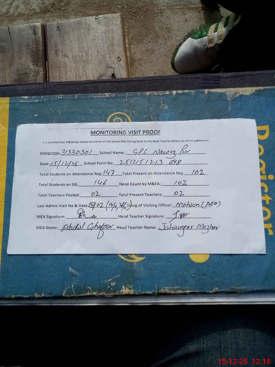 | Attendance Register | Head Teacher | MEA with School | Visit Proof |