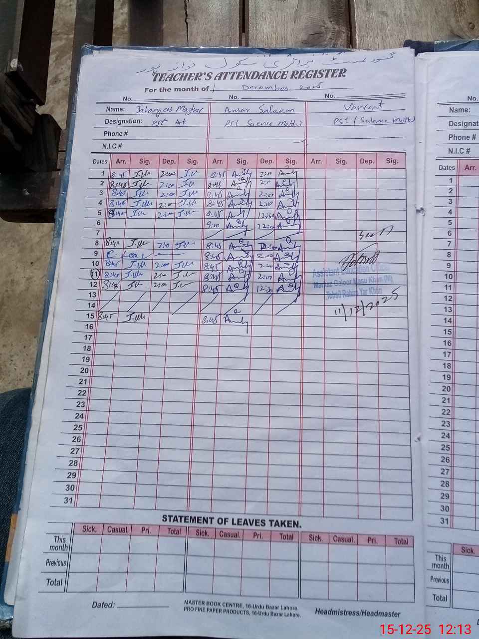 | CNIC | Full Name | Designation | R/C | Absence During Last Calender Month |
