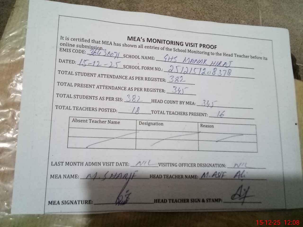 | Attendance Register | Head Teacher | MEA with School | Visit Proof |