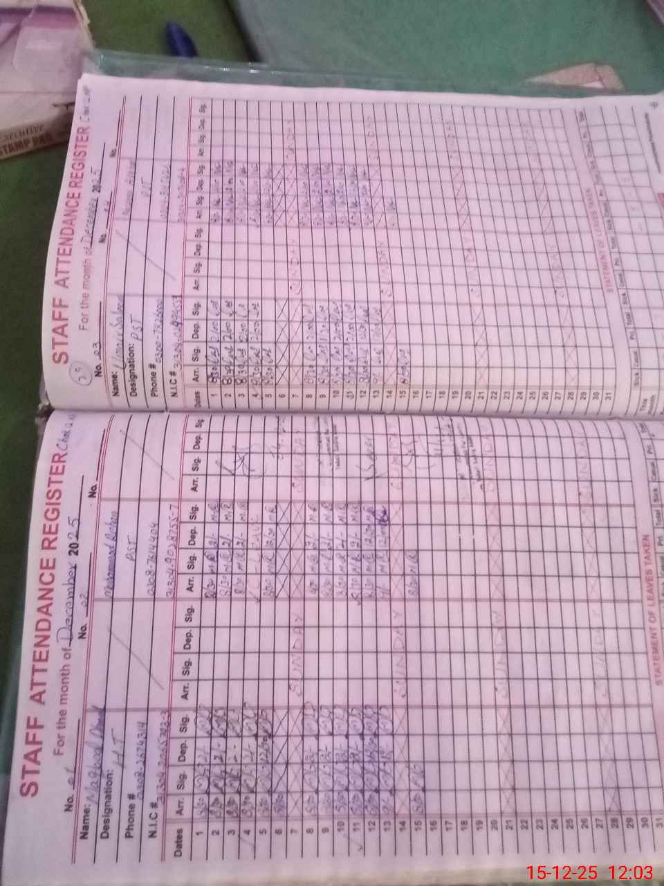 | CNIC | Full Name | Designation | R/C | Absence During Last Calender Month |