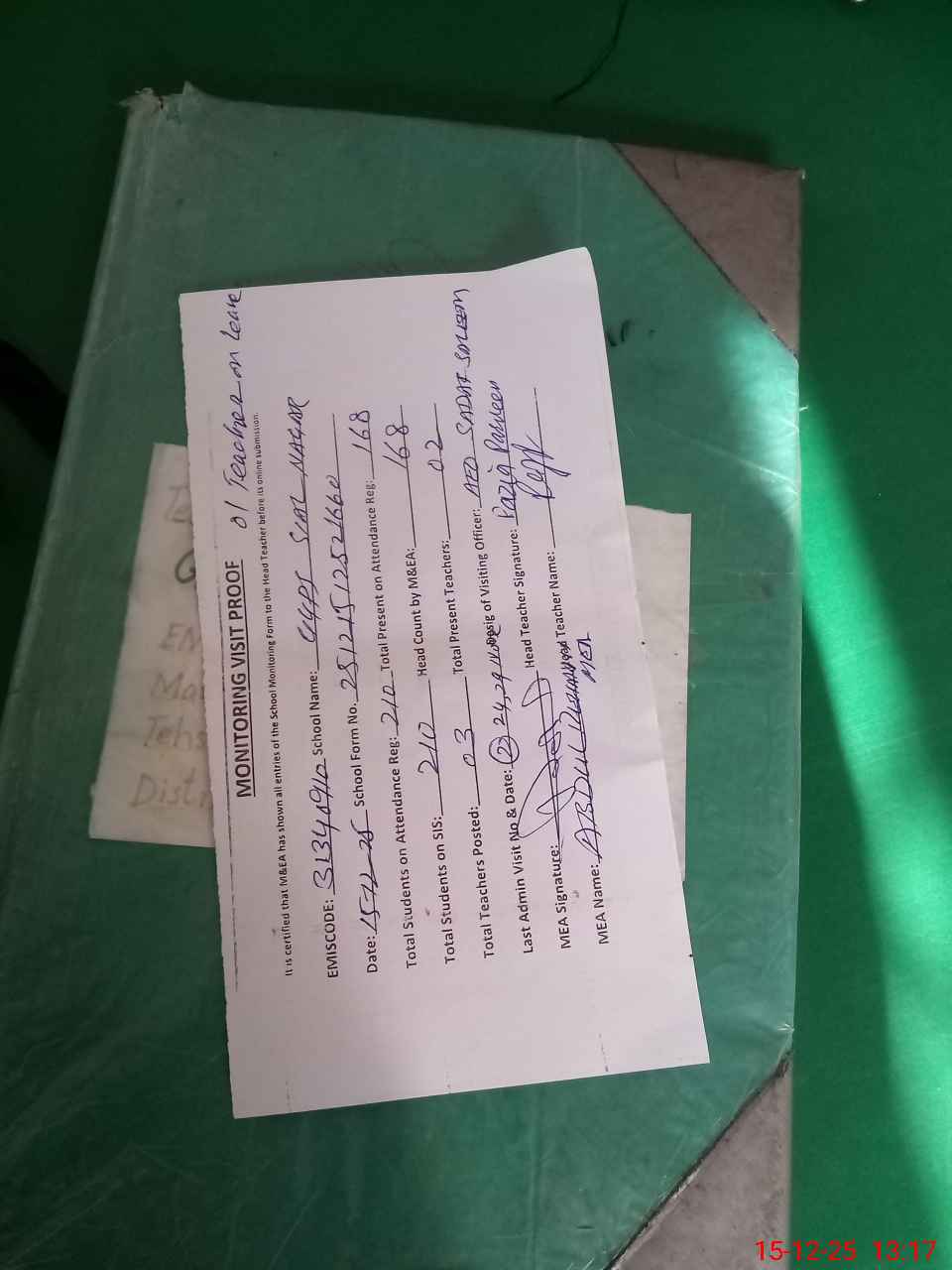 | Attendance Register | Head Teacher | MEA with School | Visit Proof |